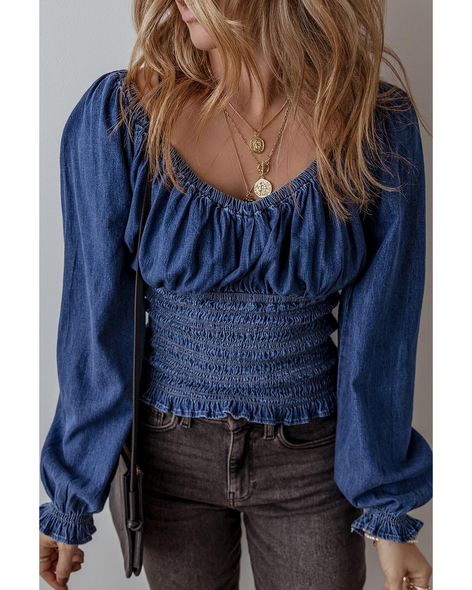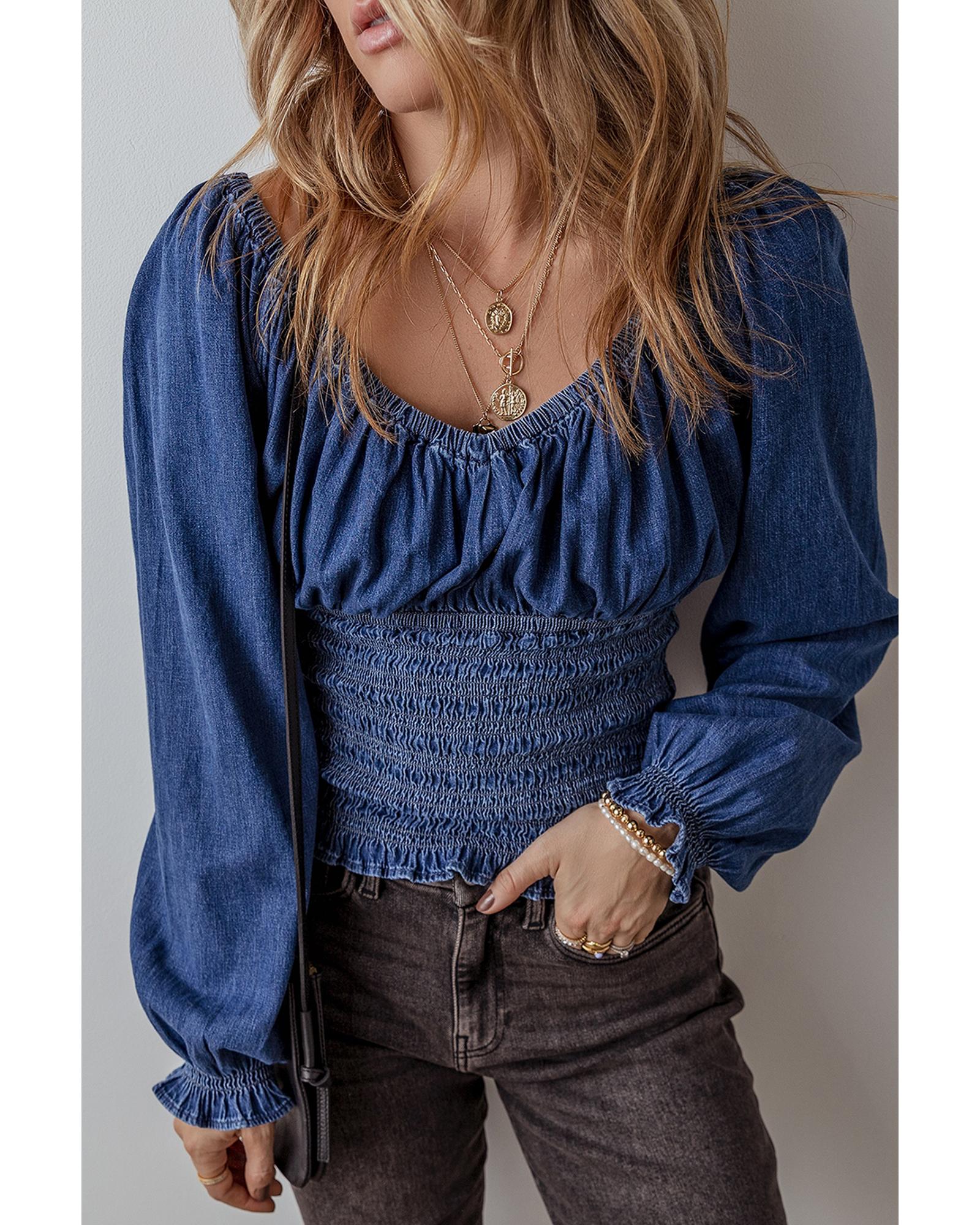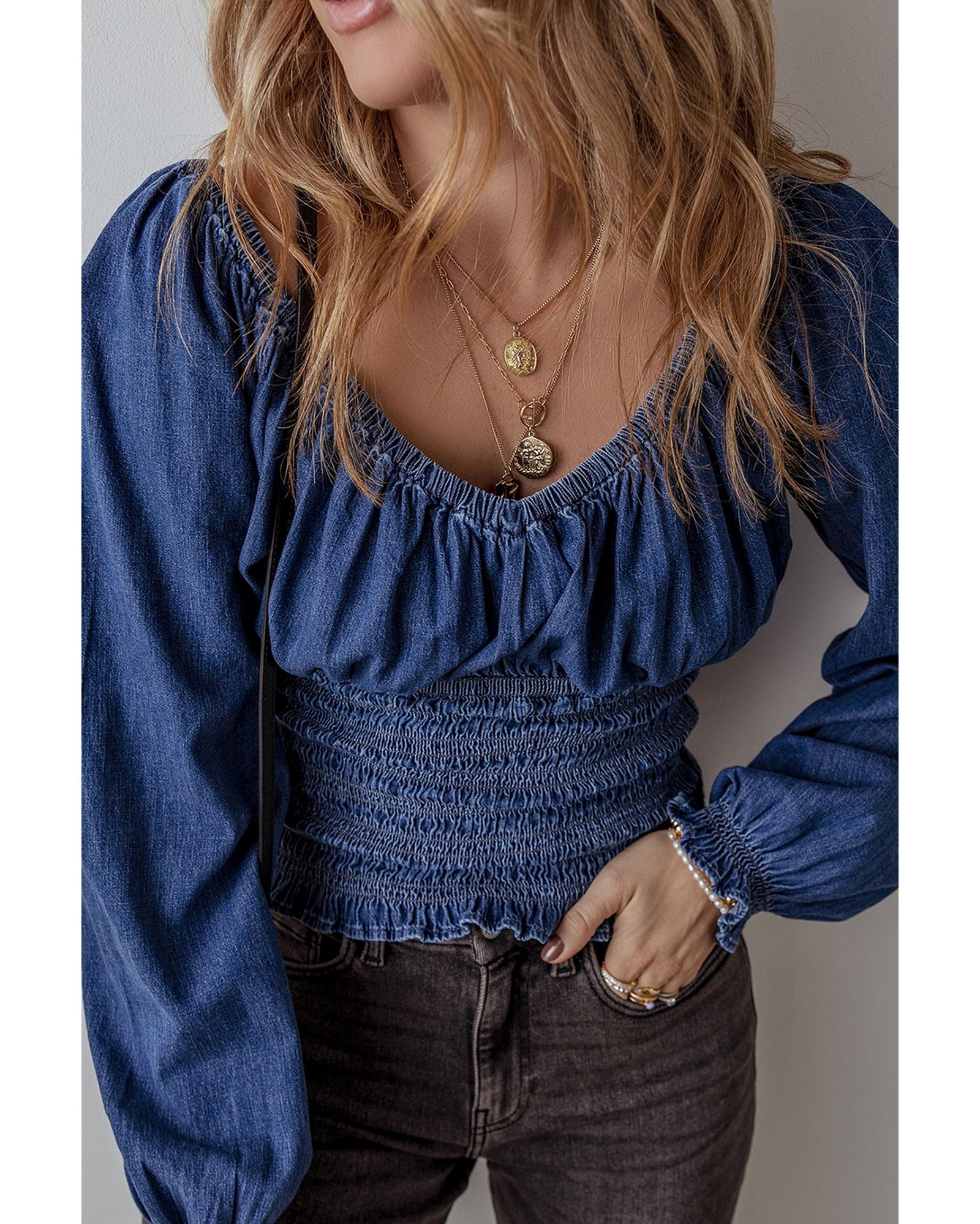 Dark Blue Smocked Ruffled Puff Sleeve V Neck Denim Blouse – L