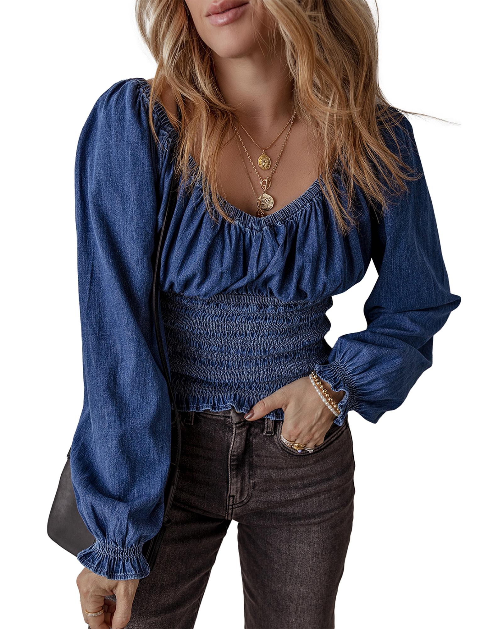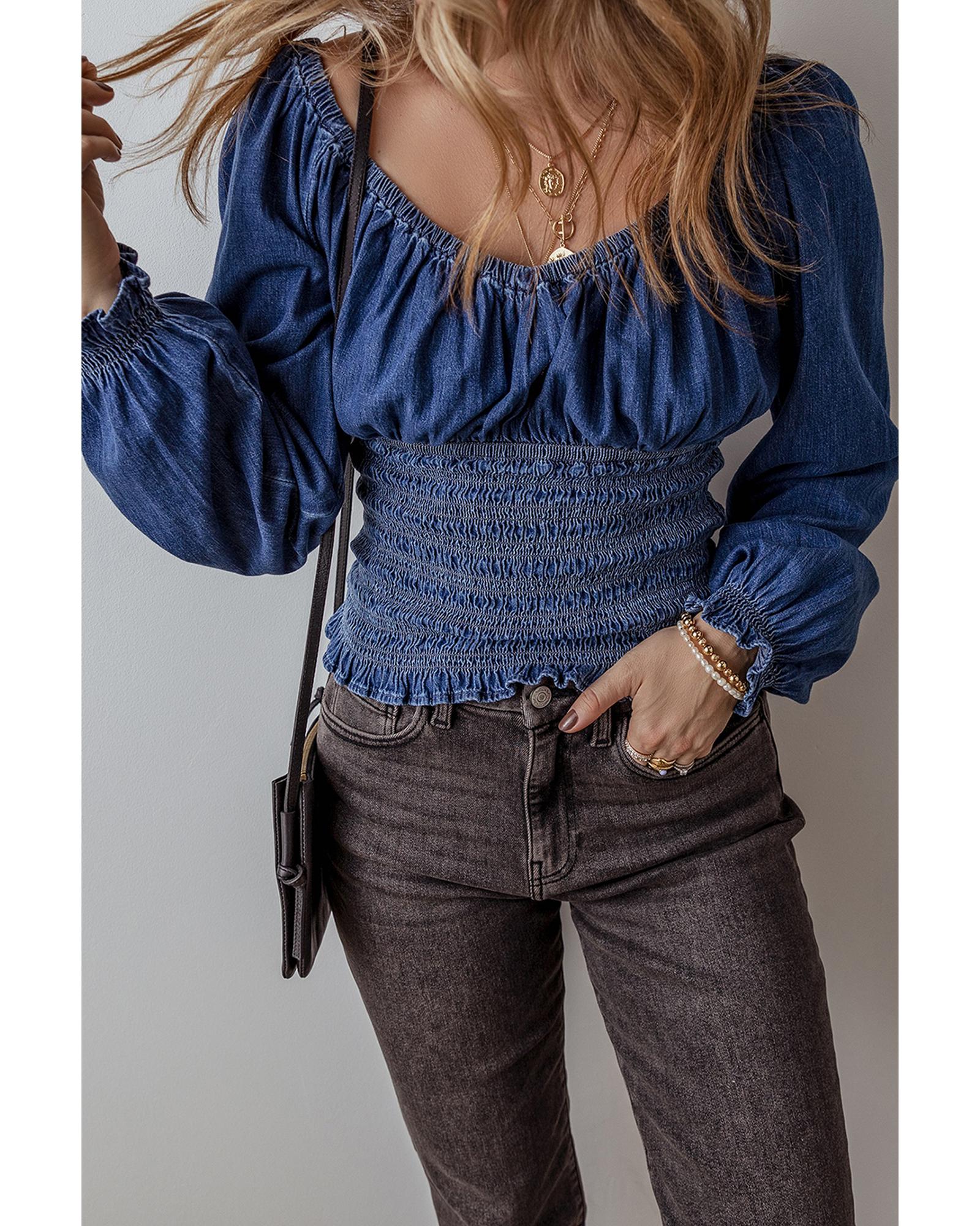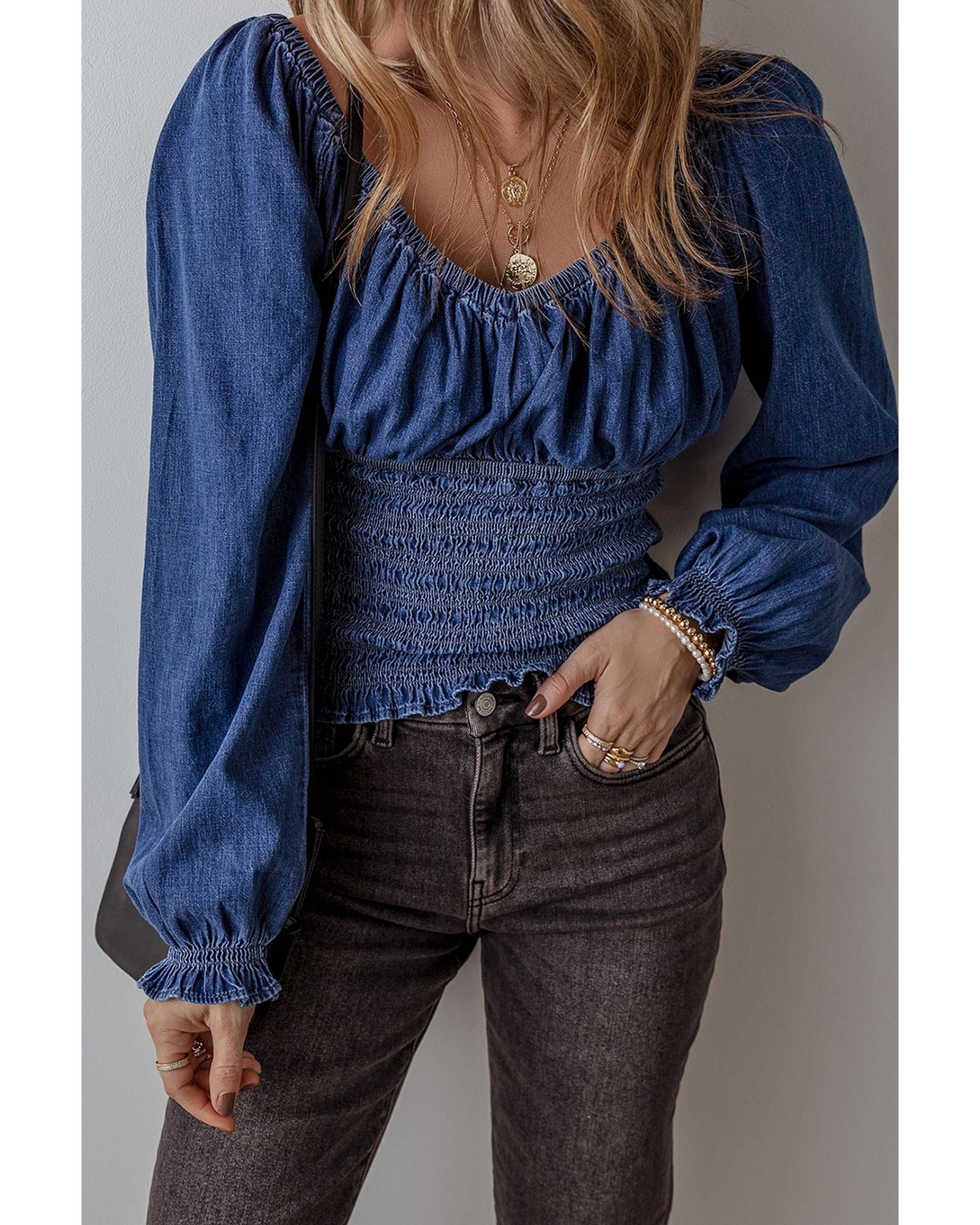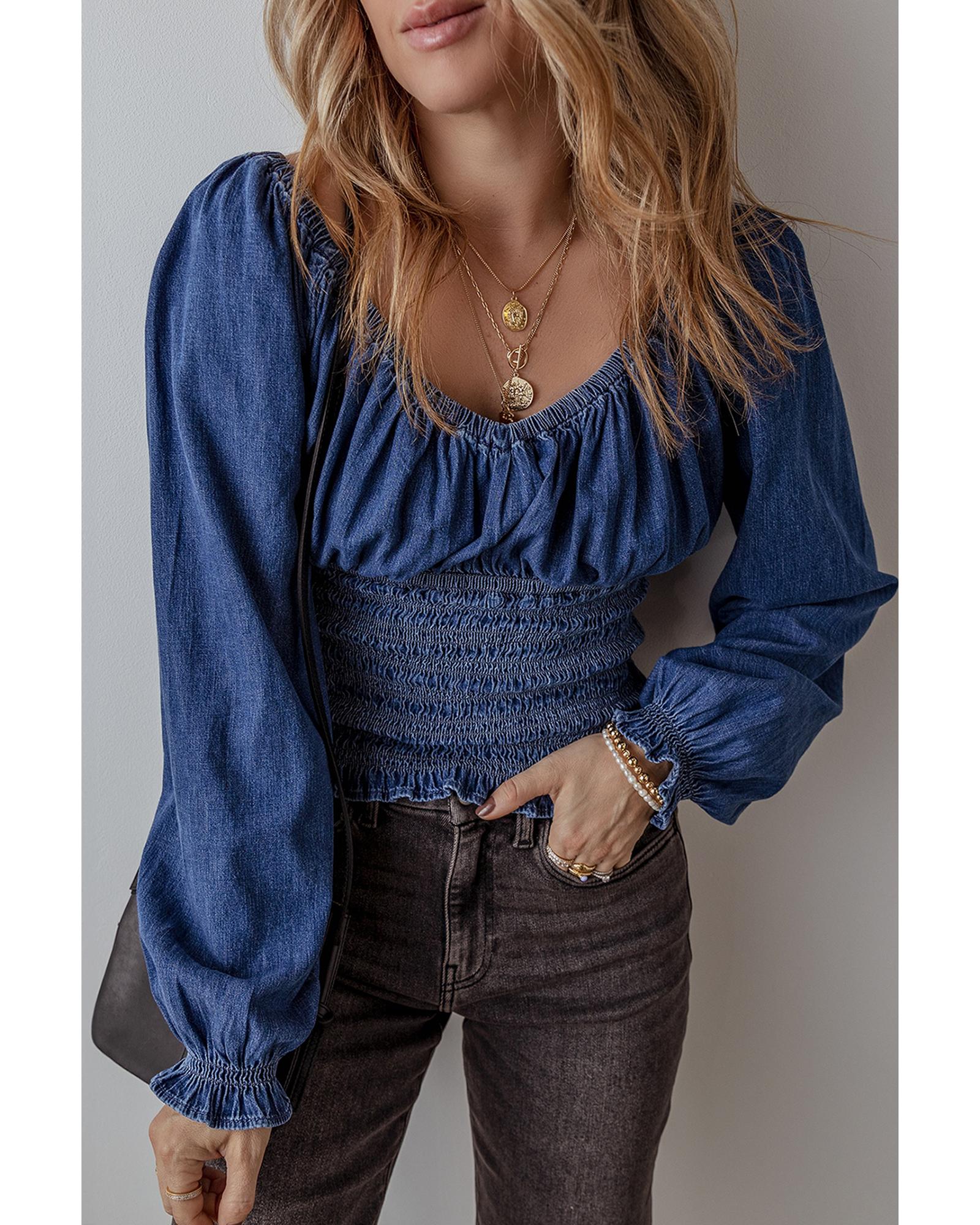 Dark Blue Smocked Ruffled Puff Sleeve V Neck Denim Blouse – L