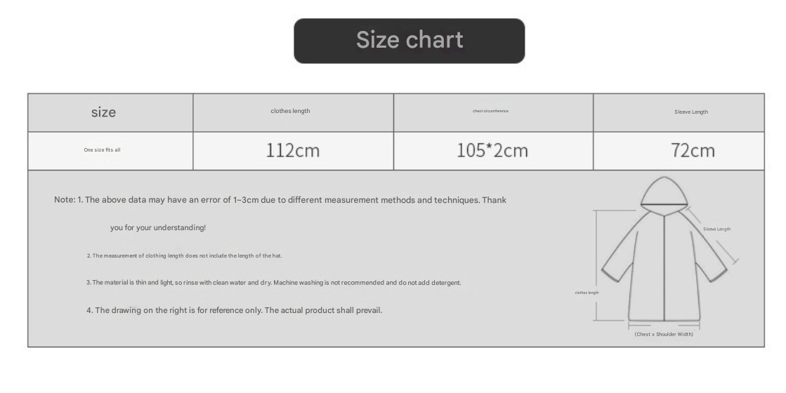 - Extended Length & Coverage: Features a generous long cut (approx. 112cm / 44″ length) and wide design (approx. 62″ width / 210cm chest circumference) providing ample coverage, even potentially over a small backpack.