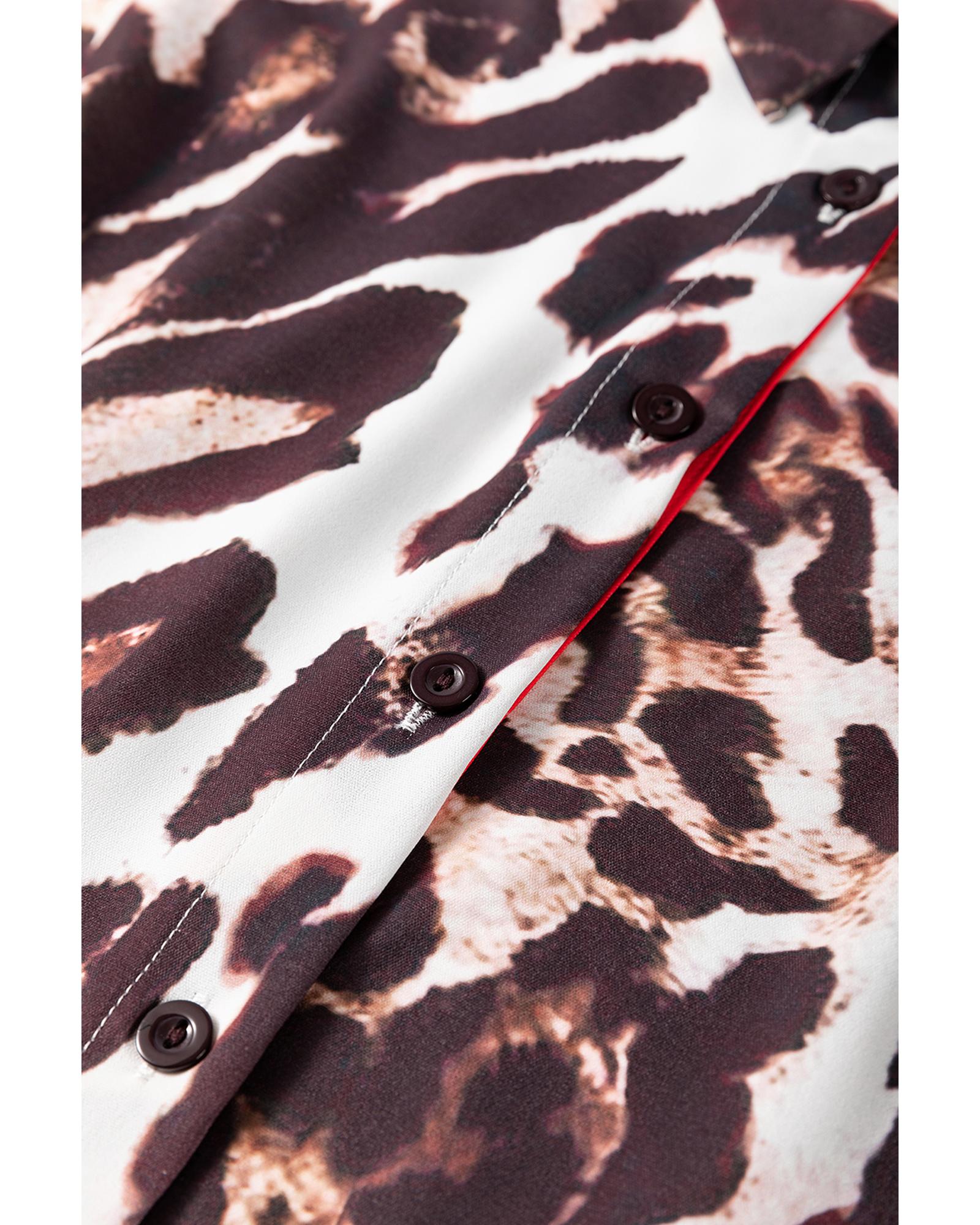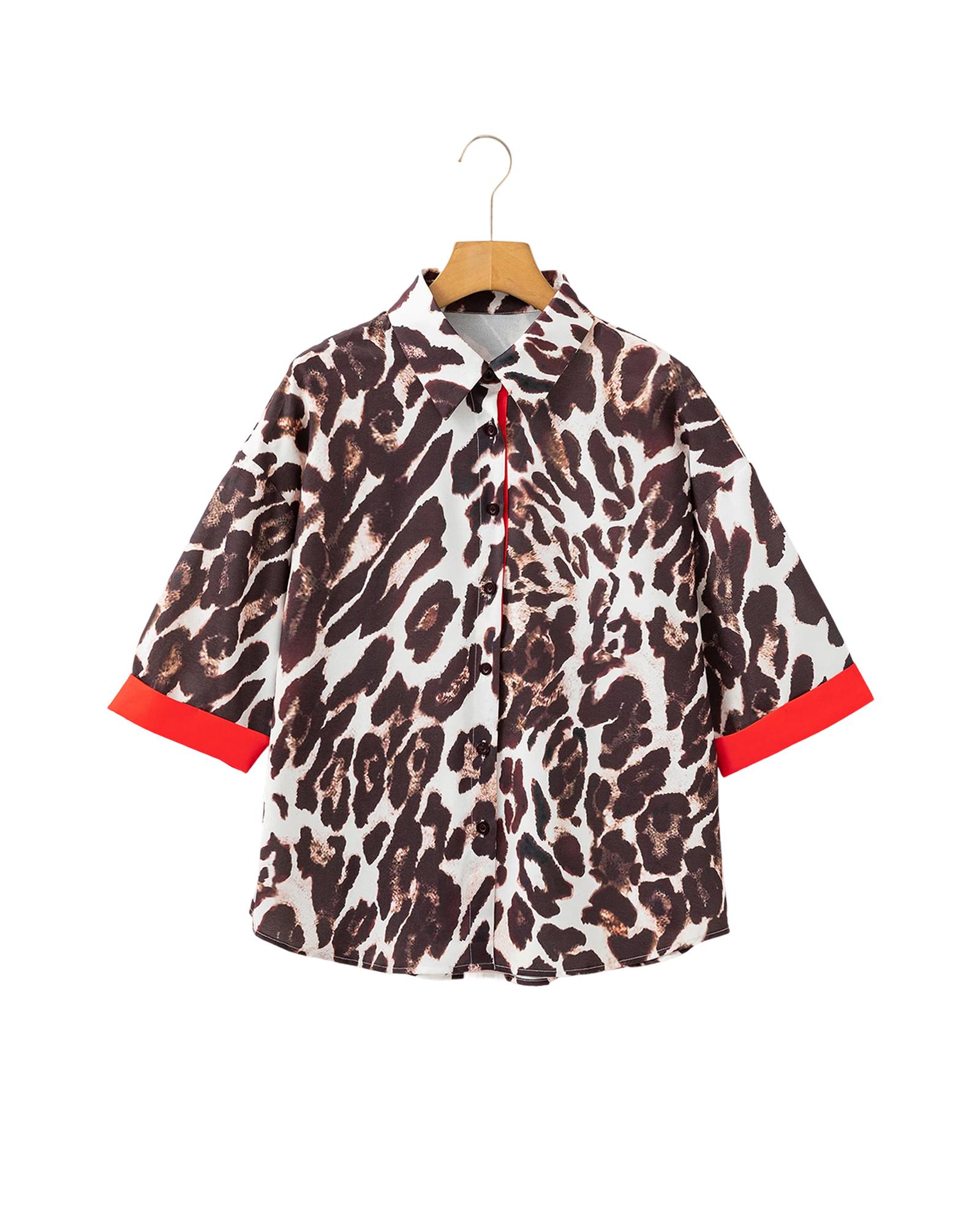 Dark Brown Contrast Trim Patchwork Leopard Print Half Sleeve Shirt – L