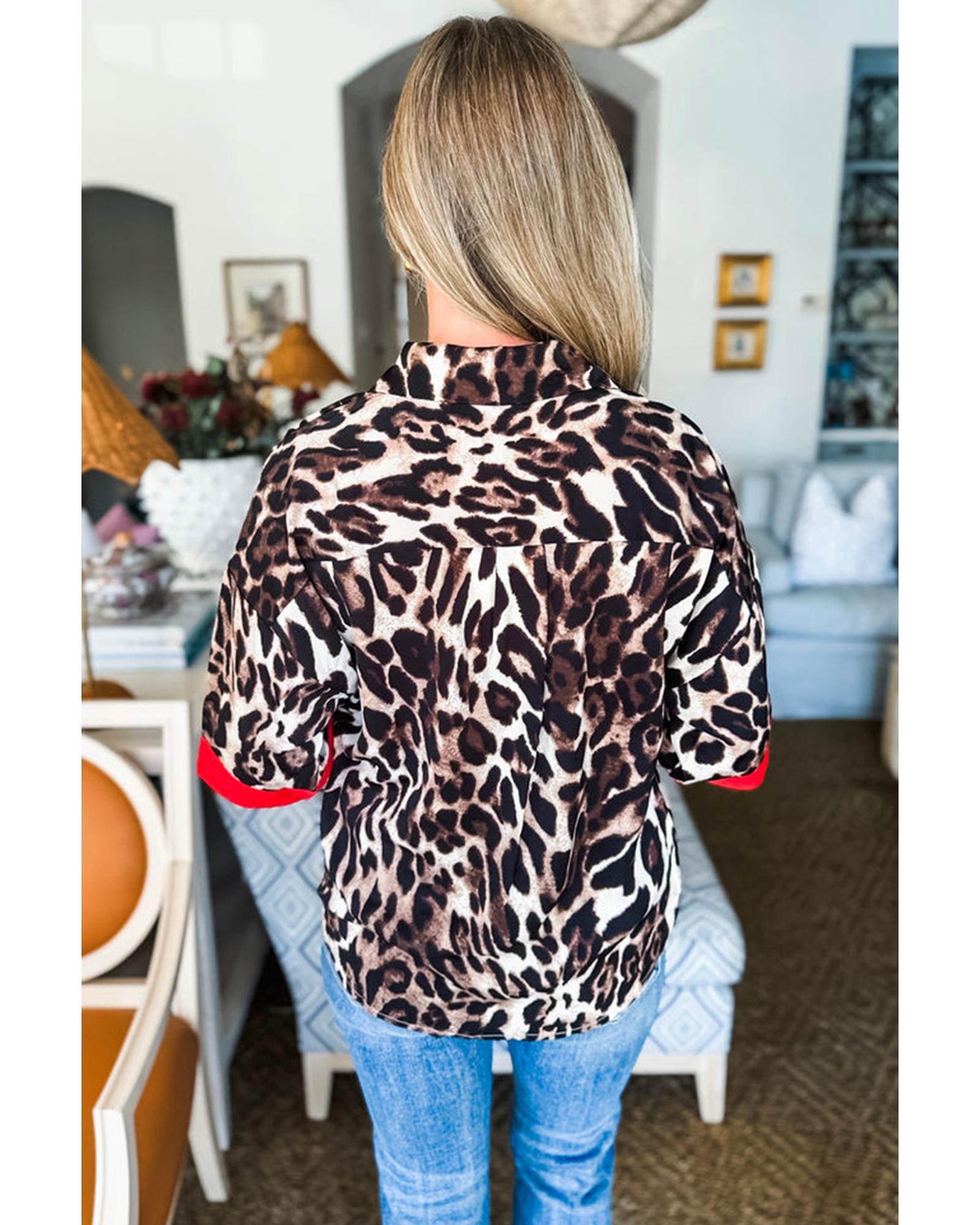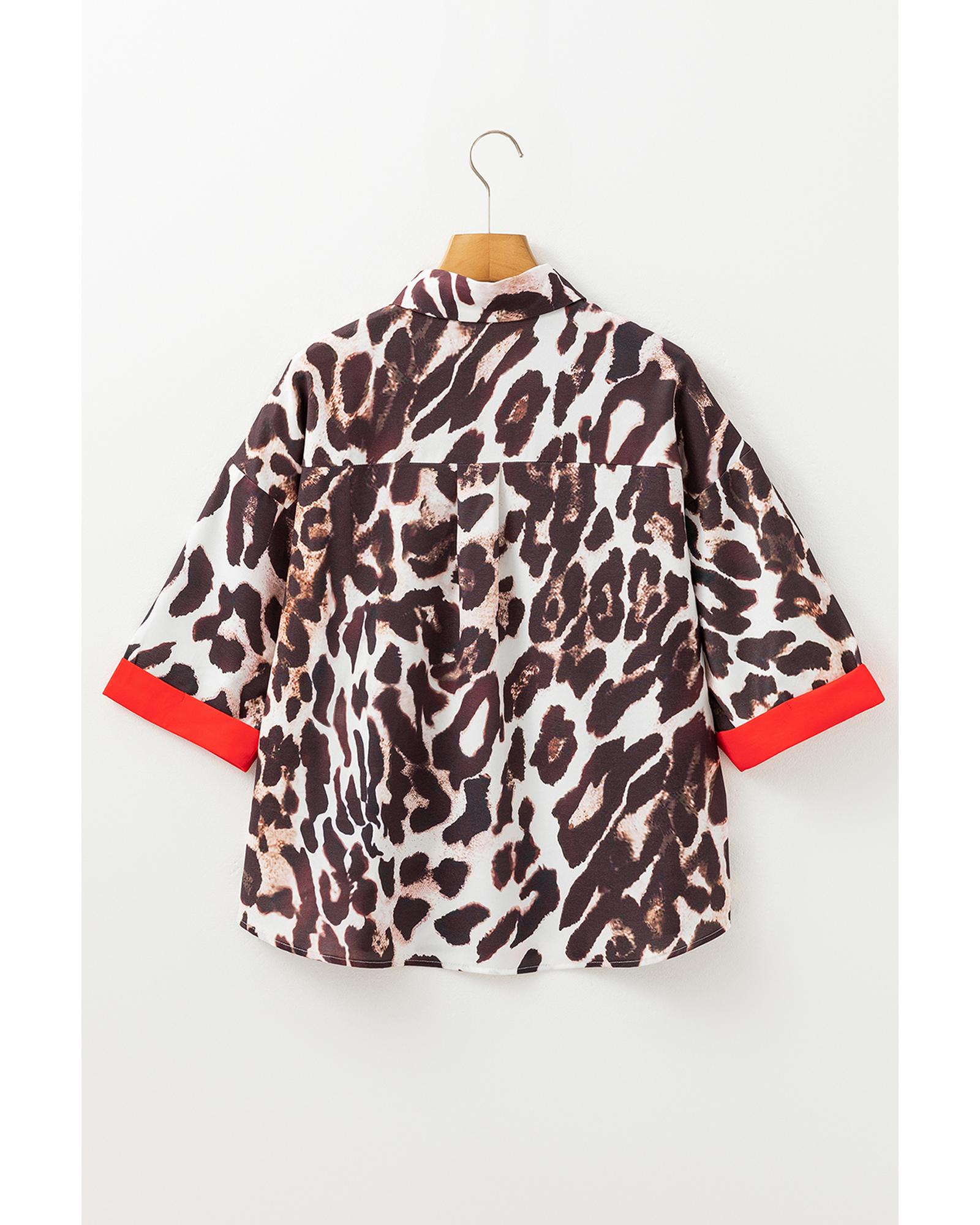 Dark Brown Contrast Trim Patchwork Leopard Print Half Sleeve Shirt – S