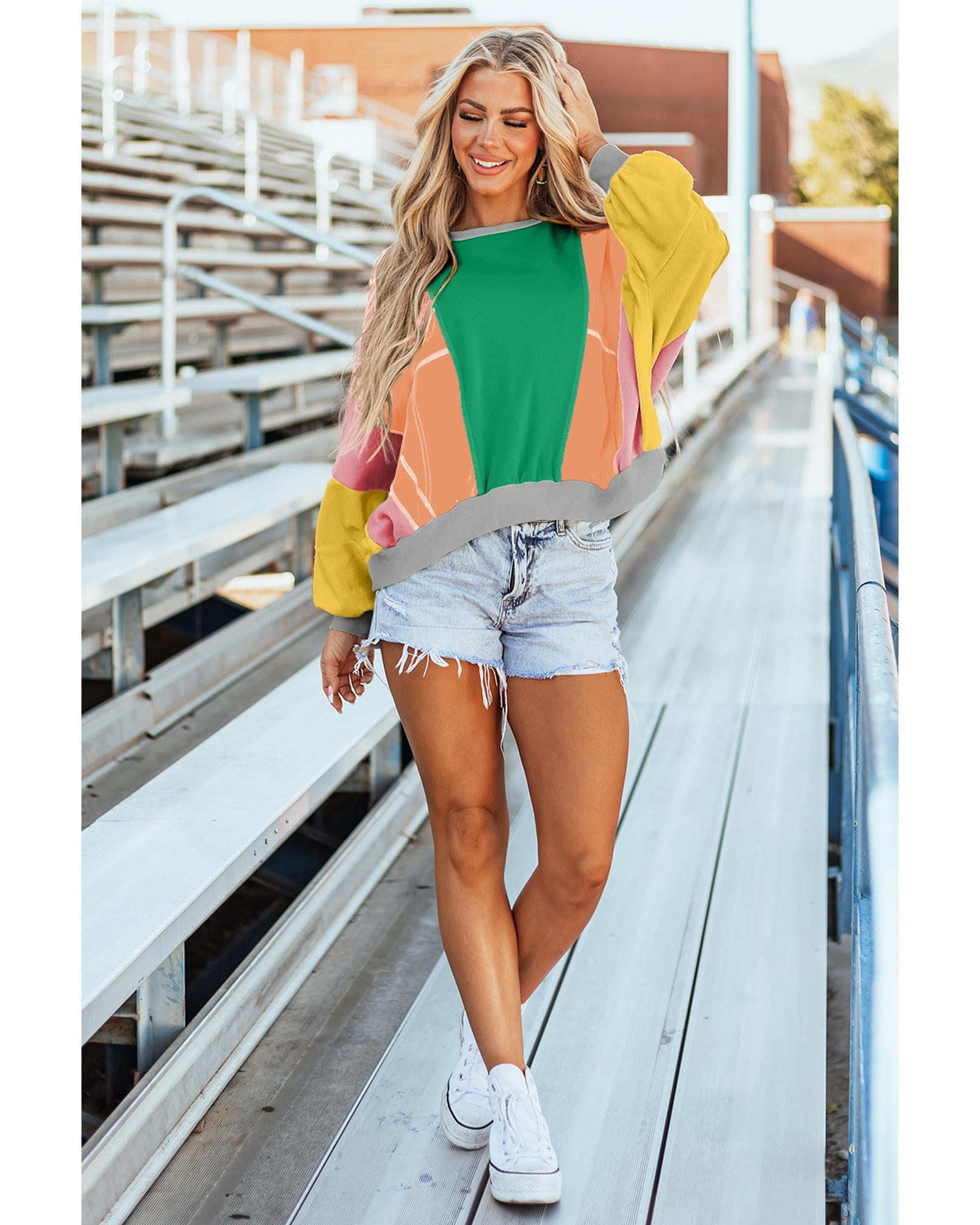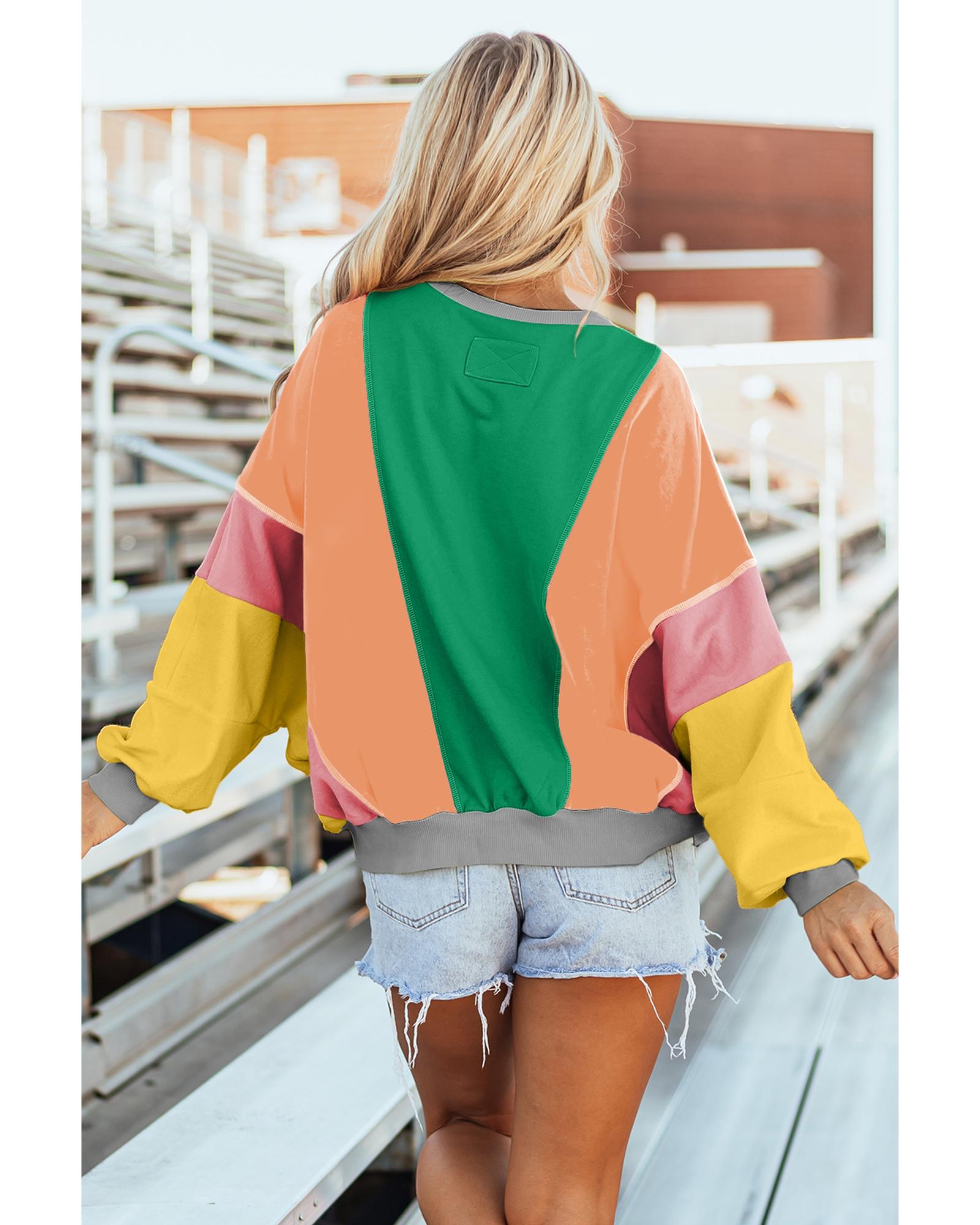 Dark Green Colorblock Patchwork Exposed Stitching Oversize Top – L