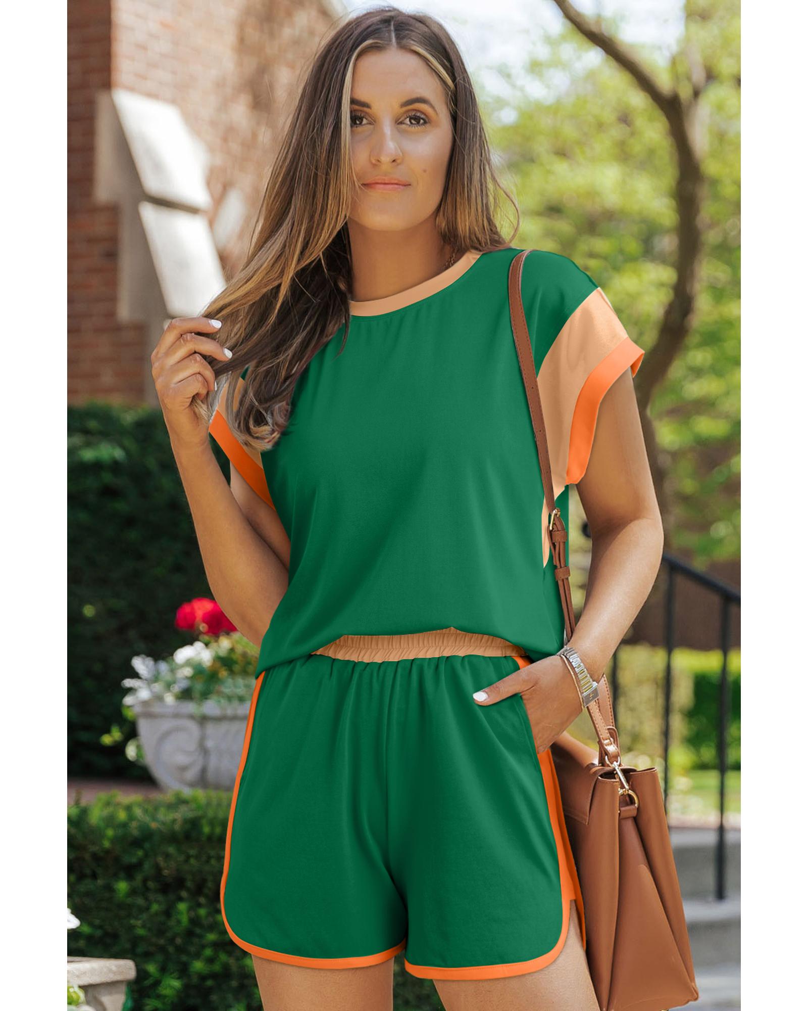 Dark Green Contrast Trim Cap Sleeve Tee Shorts Set - L