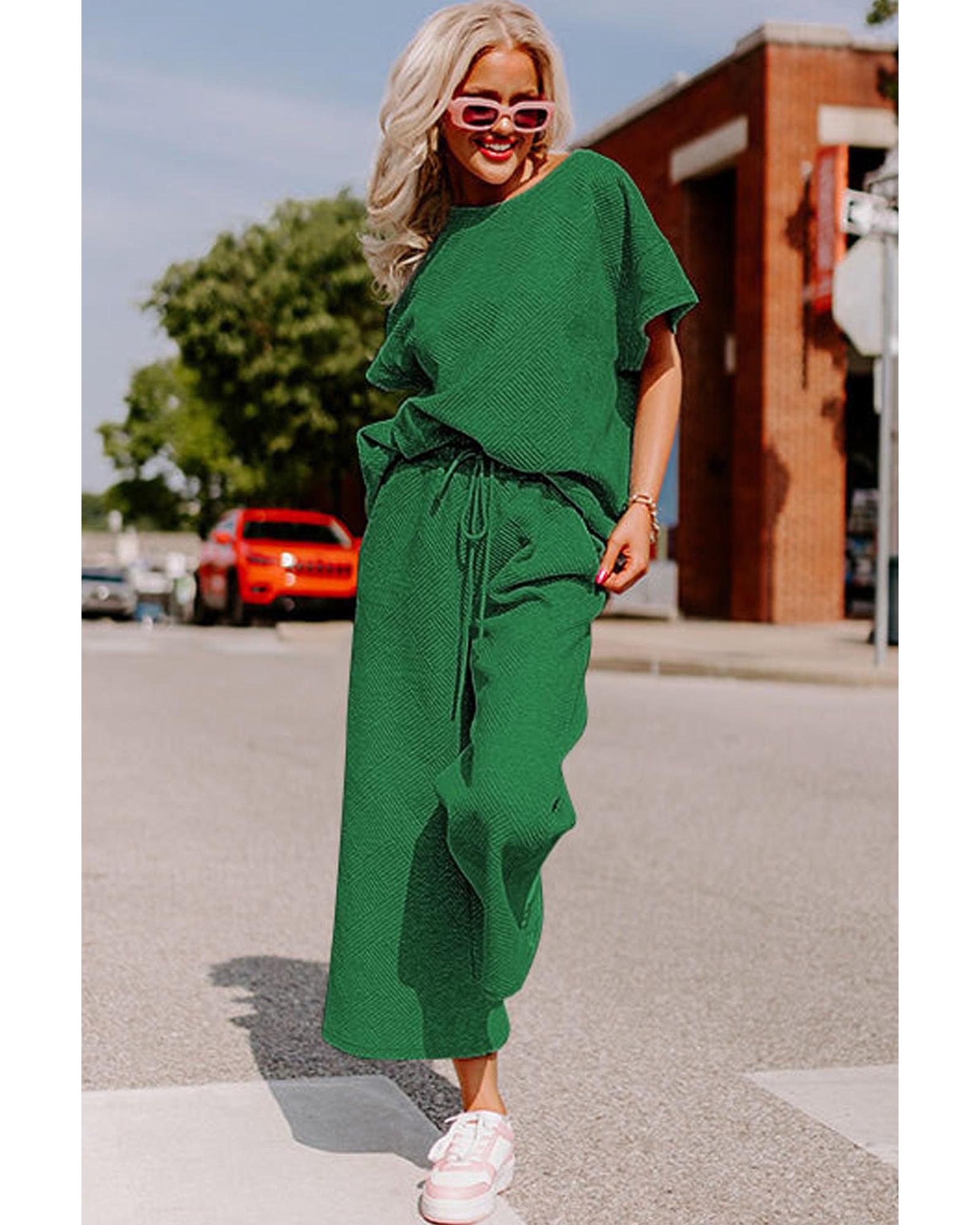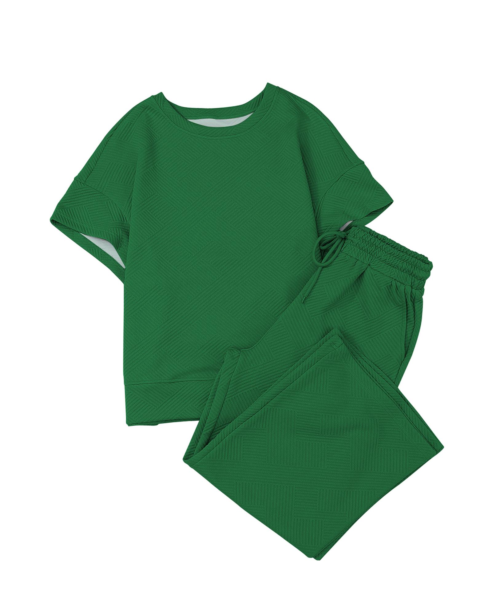 Dark Green Textured Loose Fit T Shirt and Drawstring Pants Set – L