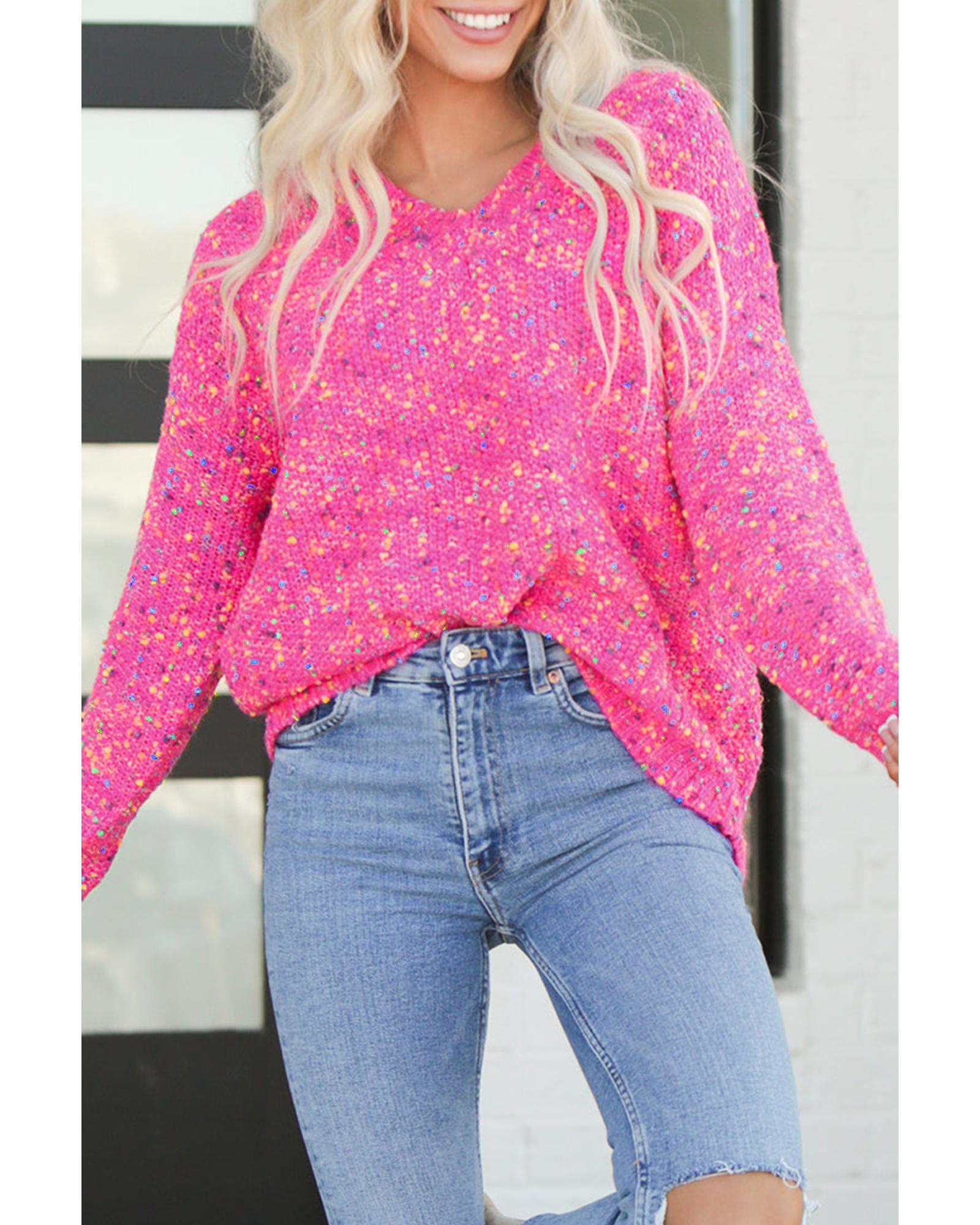 Dark Pink Colorful Spots Knitted V Neck Casual Sweater – XL