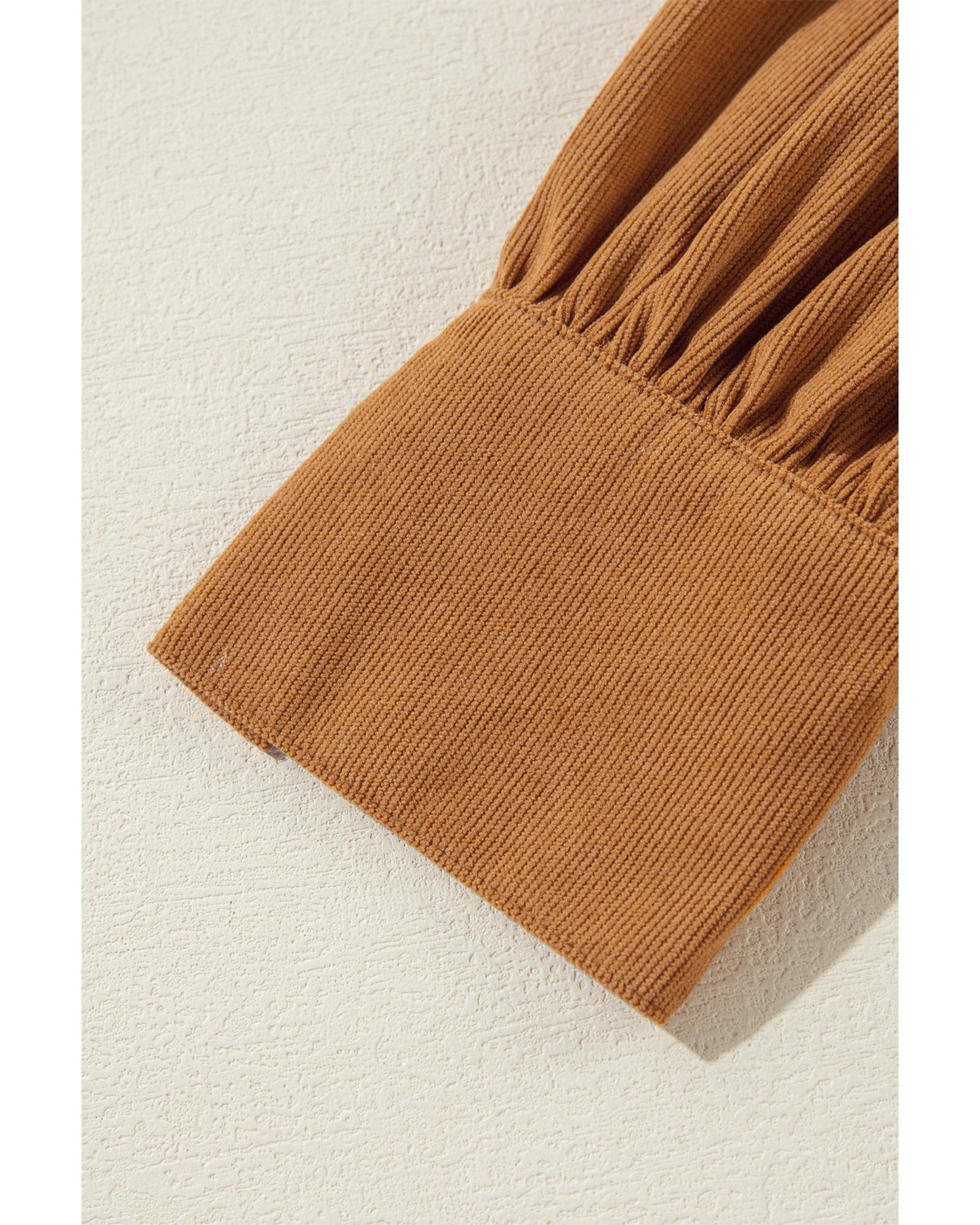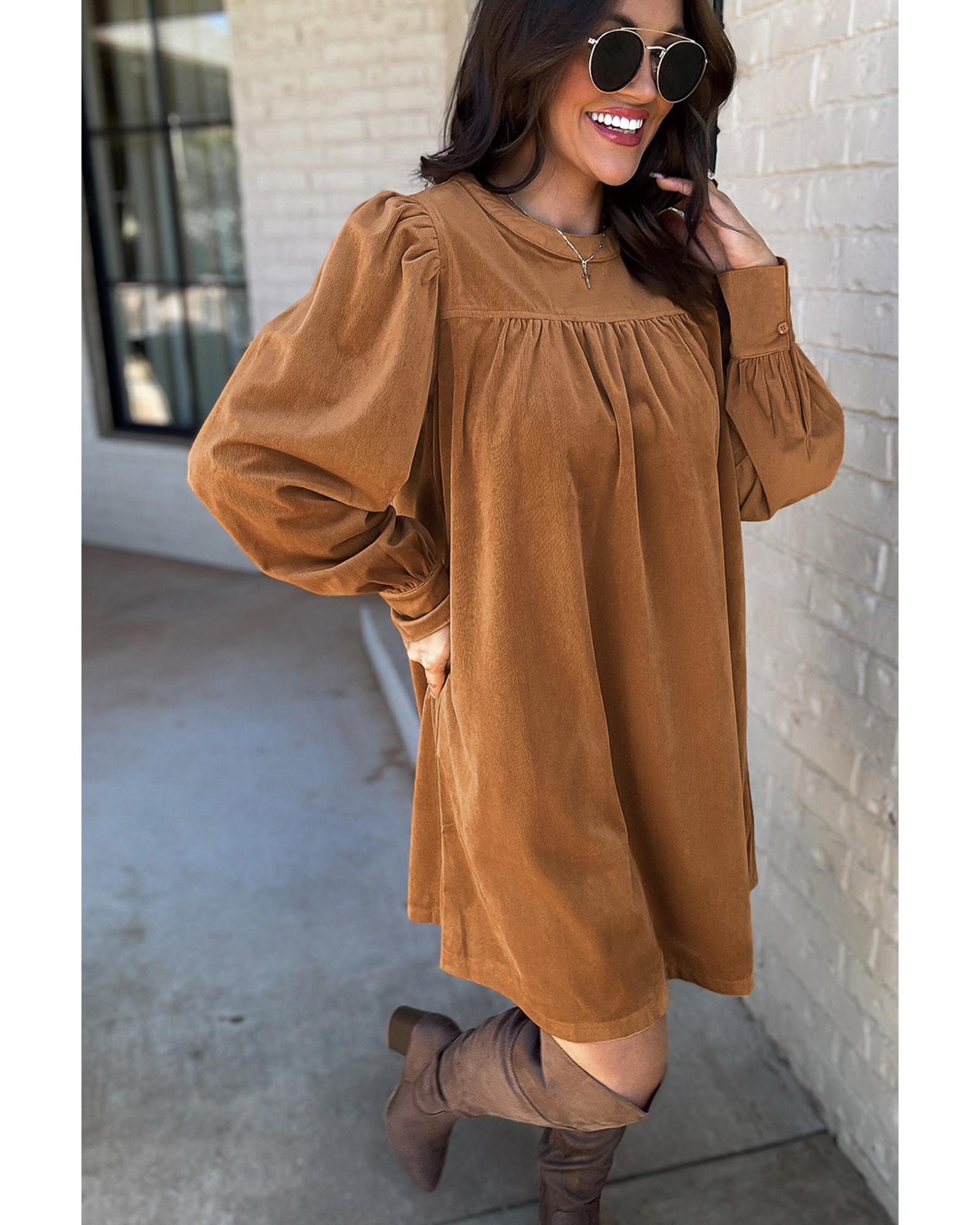 - Luxurious and elegant Desert Gold Corduroy Pleated Puff Sleeve Shift Short Dress