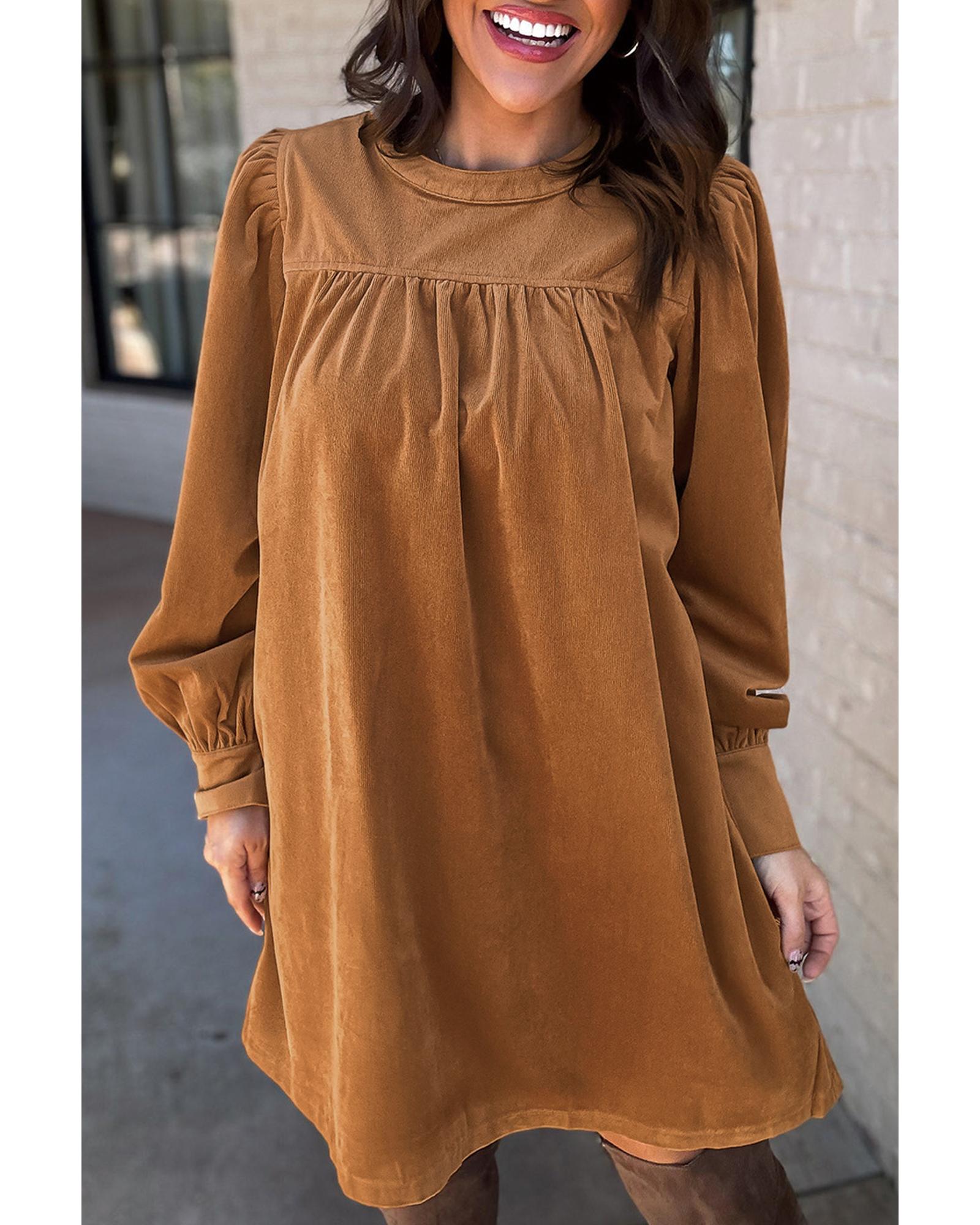 - Luxurious and elegant Desert Gold Corduroy Pleated Puff Sleeve Shift Short Dress
