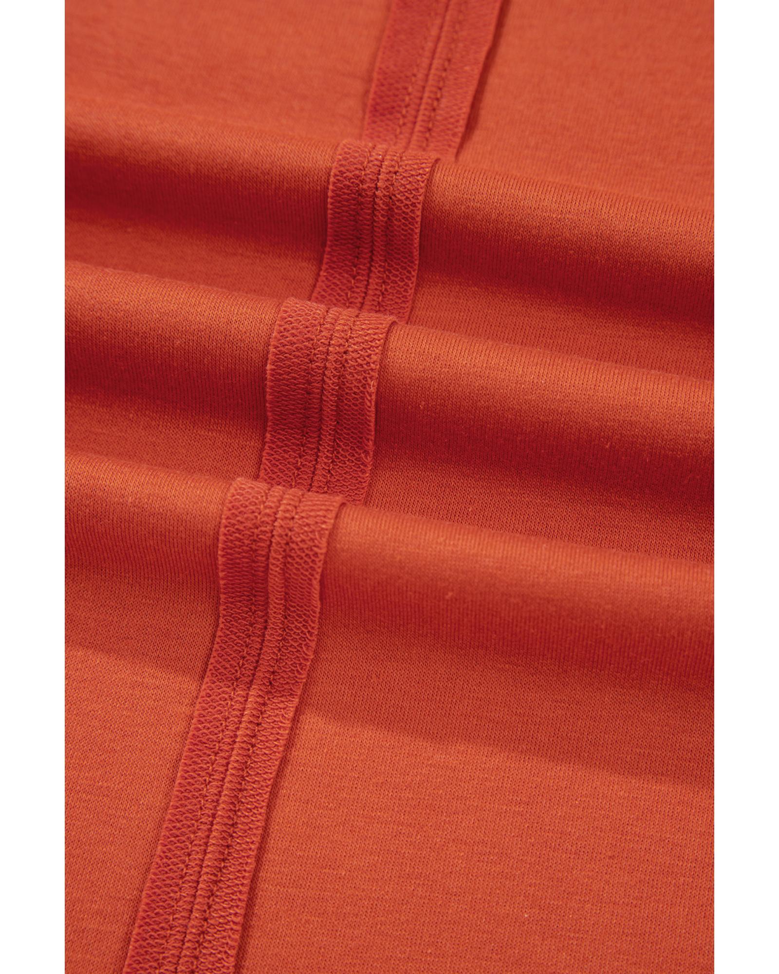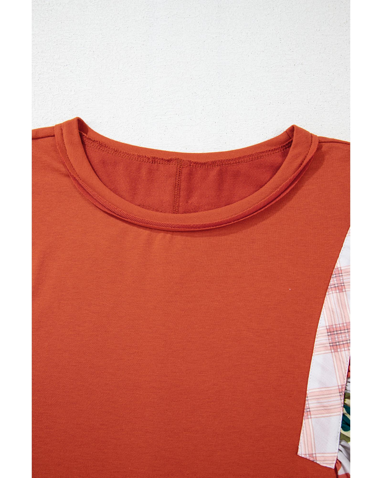 Orange Floral Color Block Patchwork Ruffled Hem Round Neck Blouse - S