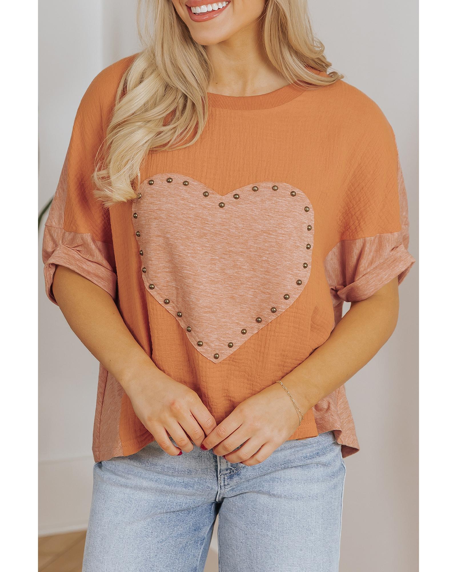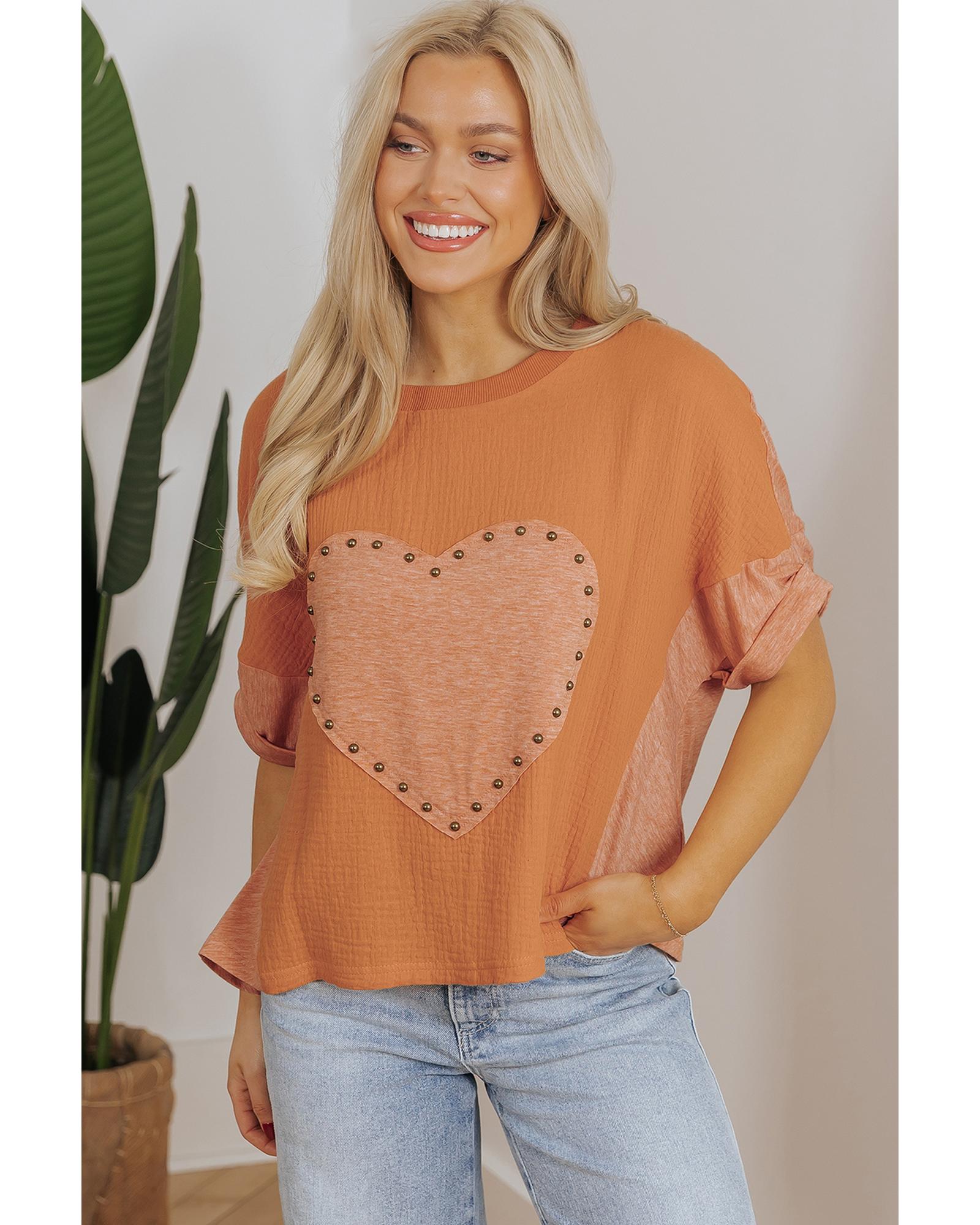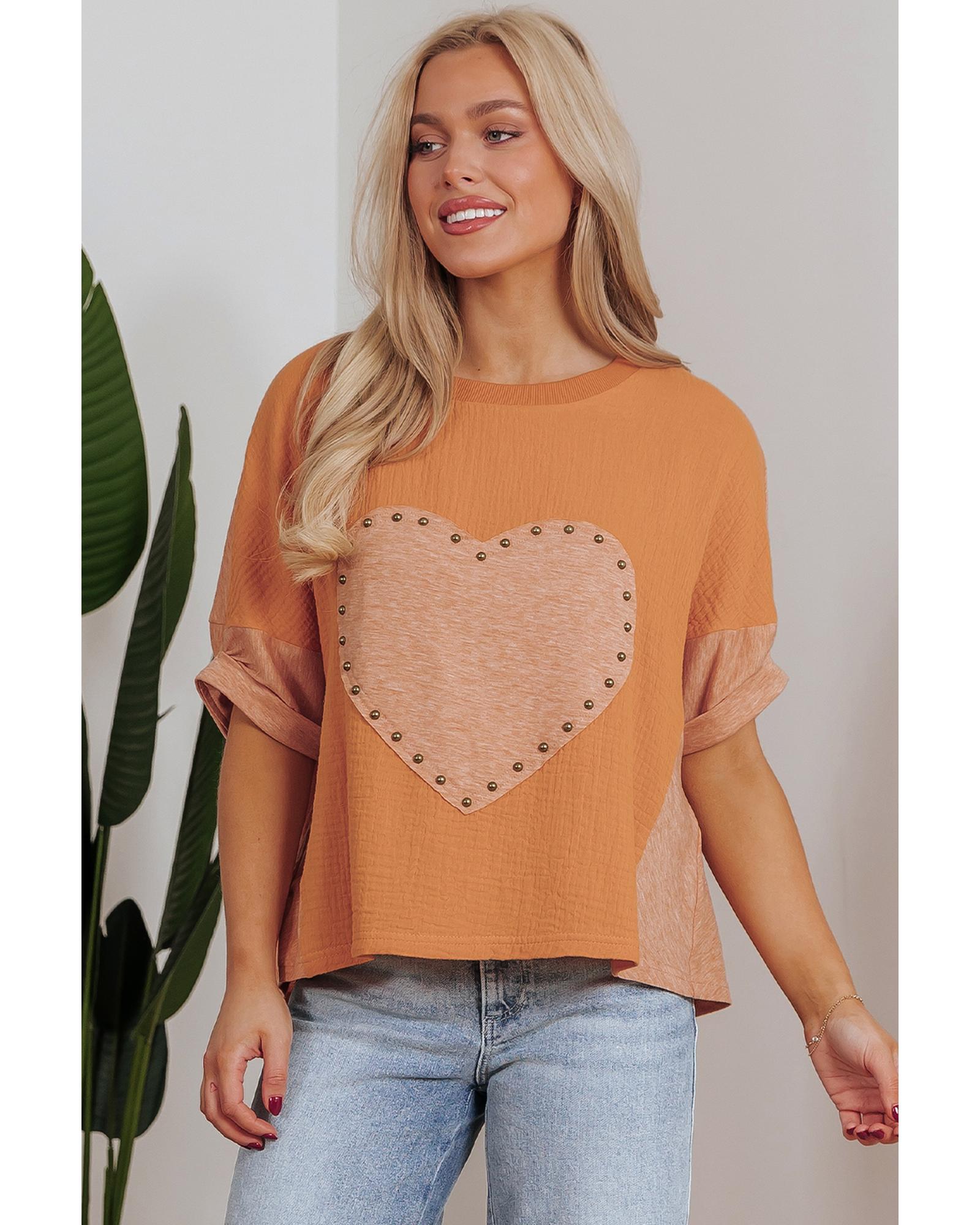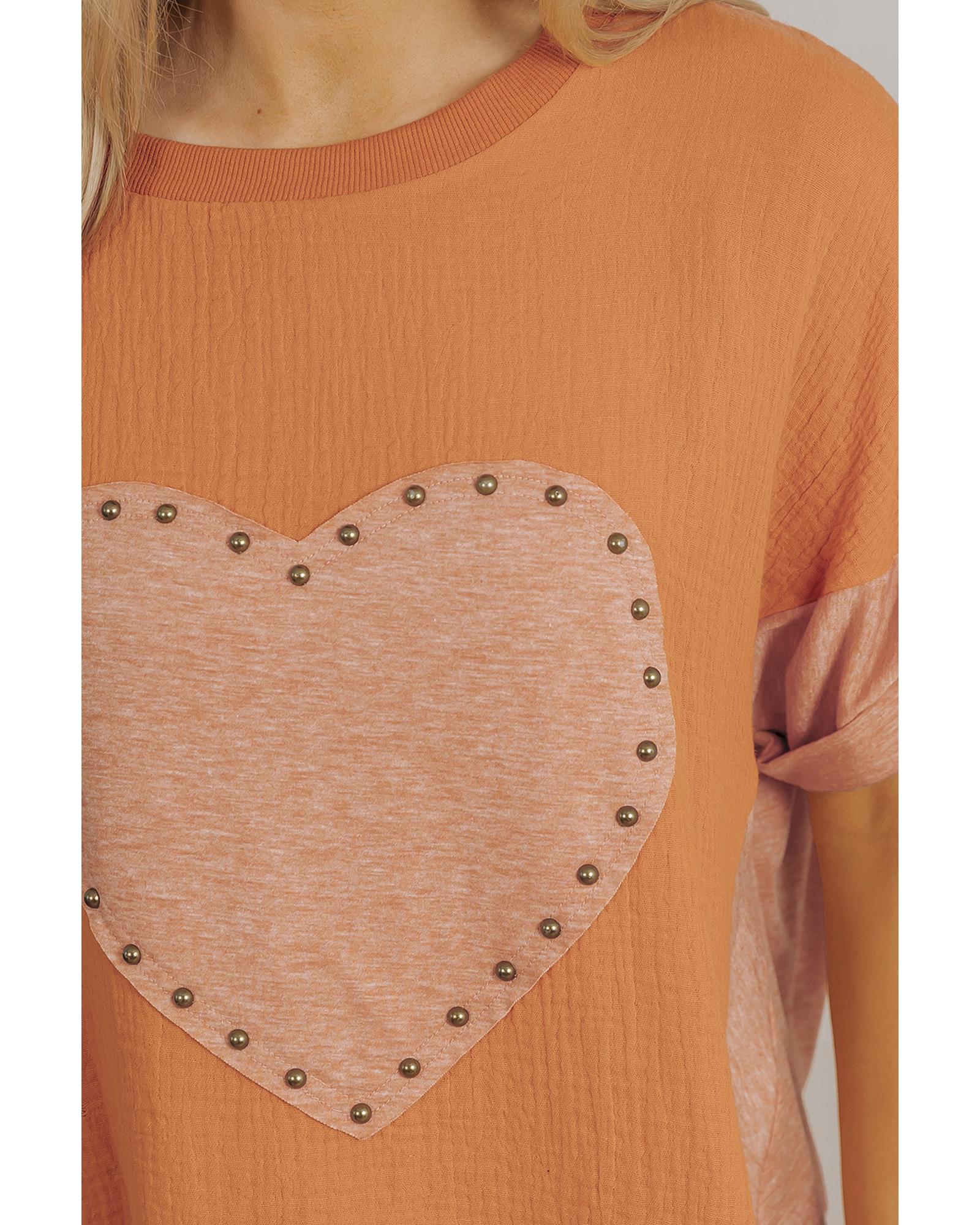 Desert Gold Stud Heart Patch Textured Front Dolman Top – S