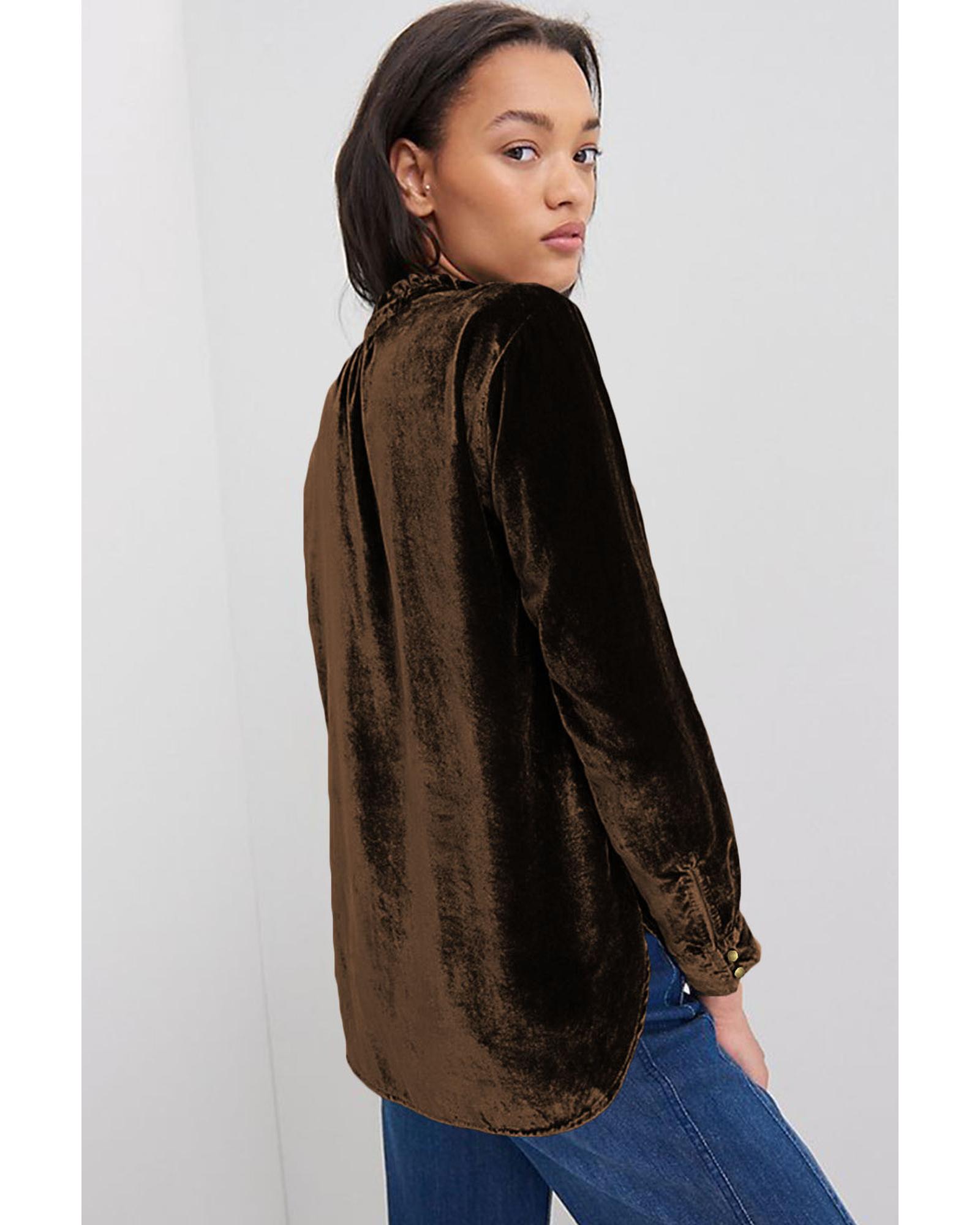 Desert Palm Frilled Neck Buttoned Front Velvet Top – L