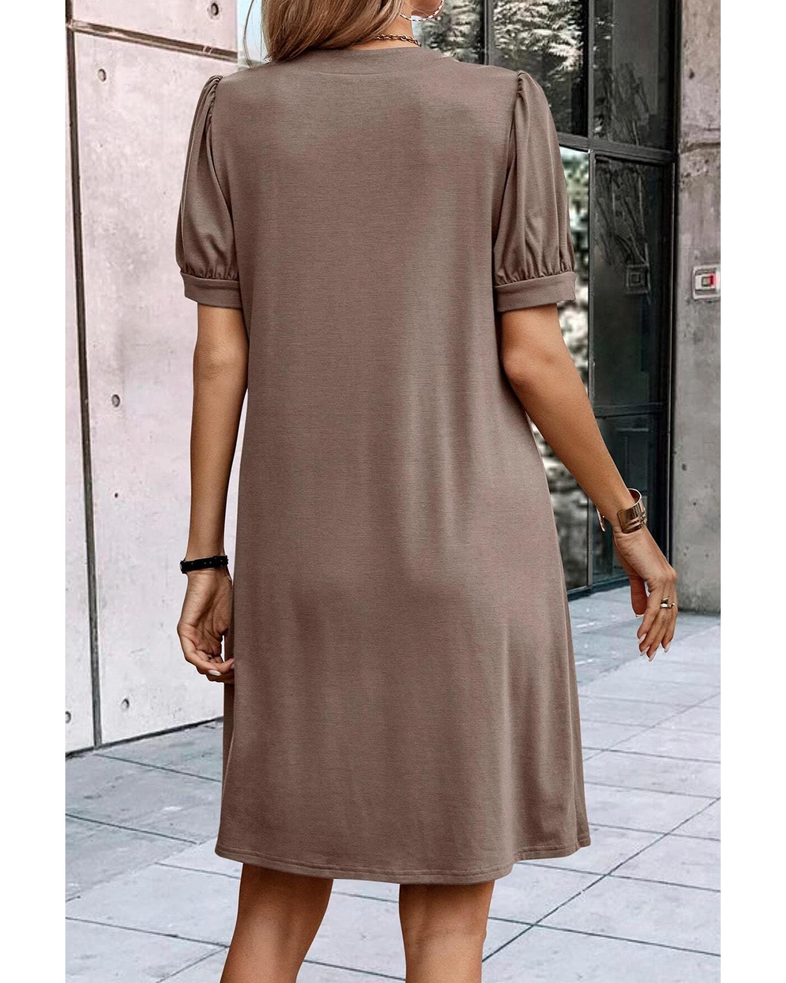 Desert Palm Notched Neck Pleated Puff Sleeve Shift T-shirt Dress – S