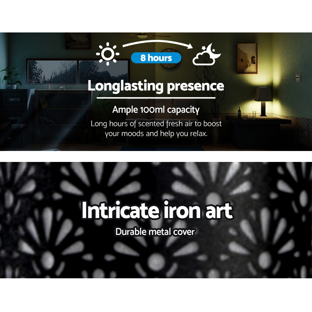 Modern life can be stressful and unforgiving, especially to your health. All the more that you should learn to relax and rejuvenate your senses to face the challenges. And that is where our Devanti Ultrasonic Aroma Diffuser can help you, to restore and maintain your aura perfectly. With its intricate fan pattern iron art, the elegant diffuser actually performs four functions in one device: humidifier, purifier, night light and aromatherapy. The ultrasonic technology uses electronic frequencies to create vibrations in water and mated with water-soluble essential oils, these are carried to the surface to create lovely therapeutic fragrances that fill the air. You can let the diffuser work continuously for up to eight hours in whisper-quiet operation or set it to turn off automatically after 1 or 2 hours. Not least, you can also adjust the level of brightness or select your desired night light colour with its 7-colour LED light to give you soothing hues all through the day or night.
