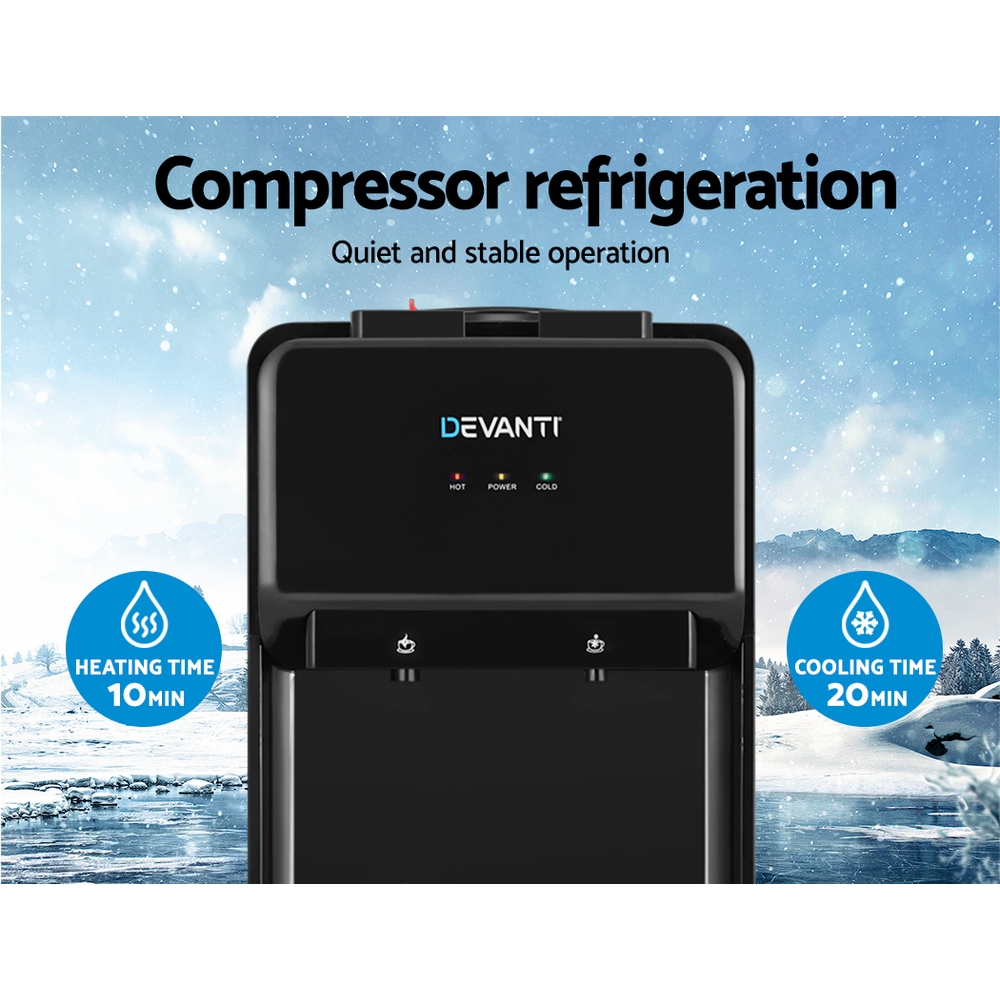 Always have access to cleaner and purer water with the Devanti Water Cooler. Designed for convenience, the compact water cooler can be used on any desktop or kitchen bench to dispense clear and pure water anytime. It comes with dual hot and cold waterspouts and a hot-cold water on/off switch for easy use. Compressor cooling technology helps the cooler get your cold water to the perfect temperature in just 20 minutes, while a piping hot cup of tea can be poured from the hot waterspout in just 10 minutes. Safety is assured with a child-lock function to prevent children from tampering with the cooler as well as protection from over-current, overheating, electric shocks and drying up. The cooler also has a removable drip tray, a water guide plate for use with standard water bottles, and anti-slip feet to prevent movement. Enjoy a cool and clean glass of water at any time with the Devanti Water Cooler.