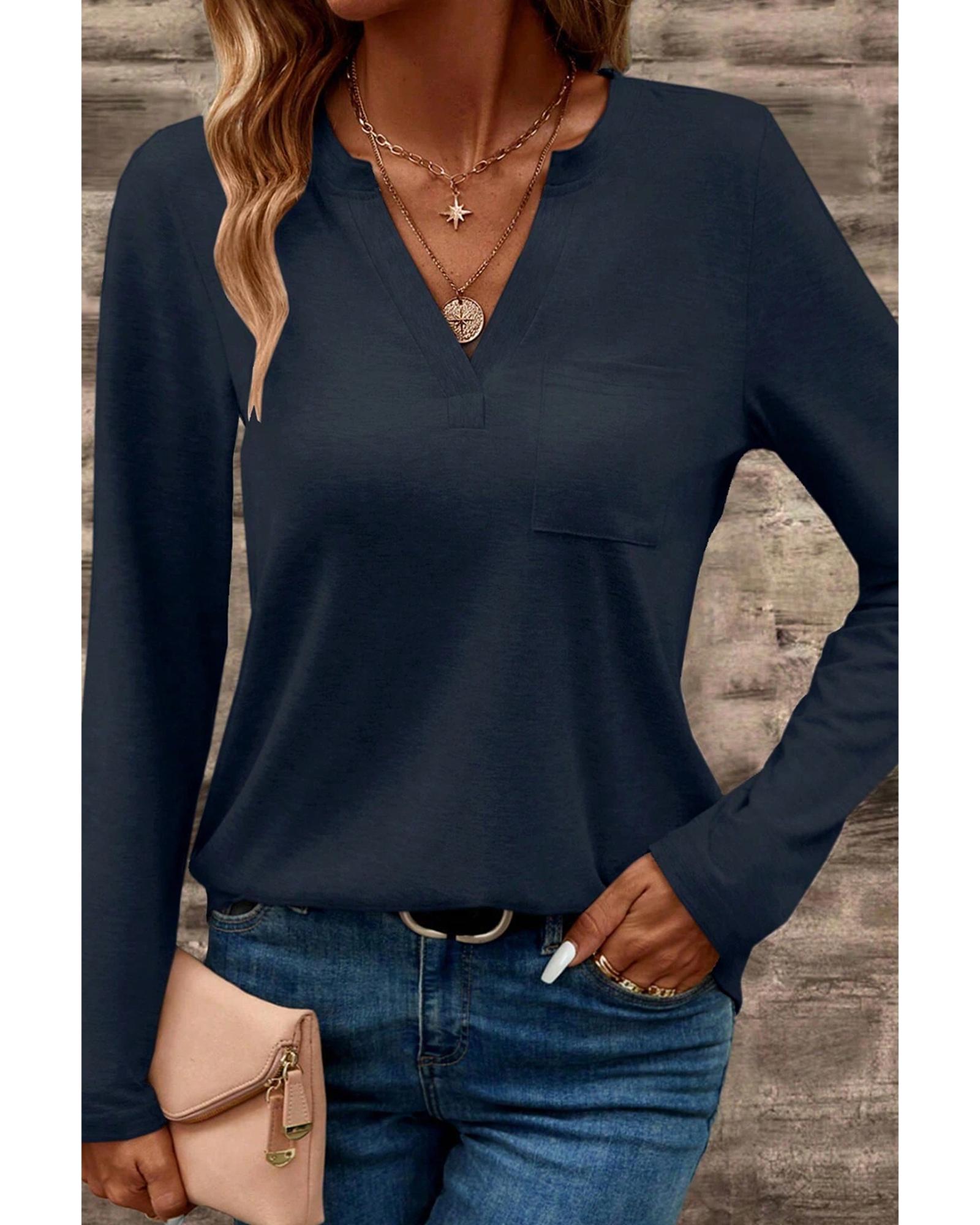 Dirty blue Notch V Neck Pocket Patched Long Sleeve T Shirt – L