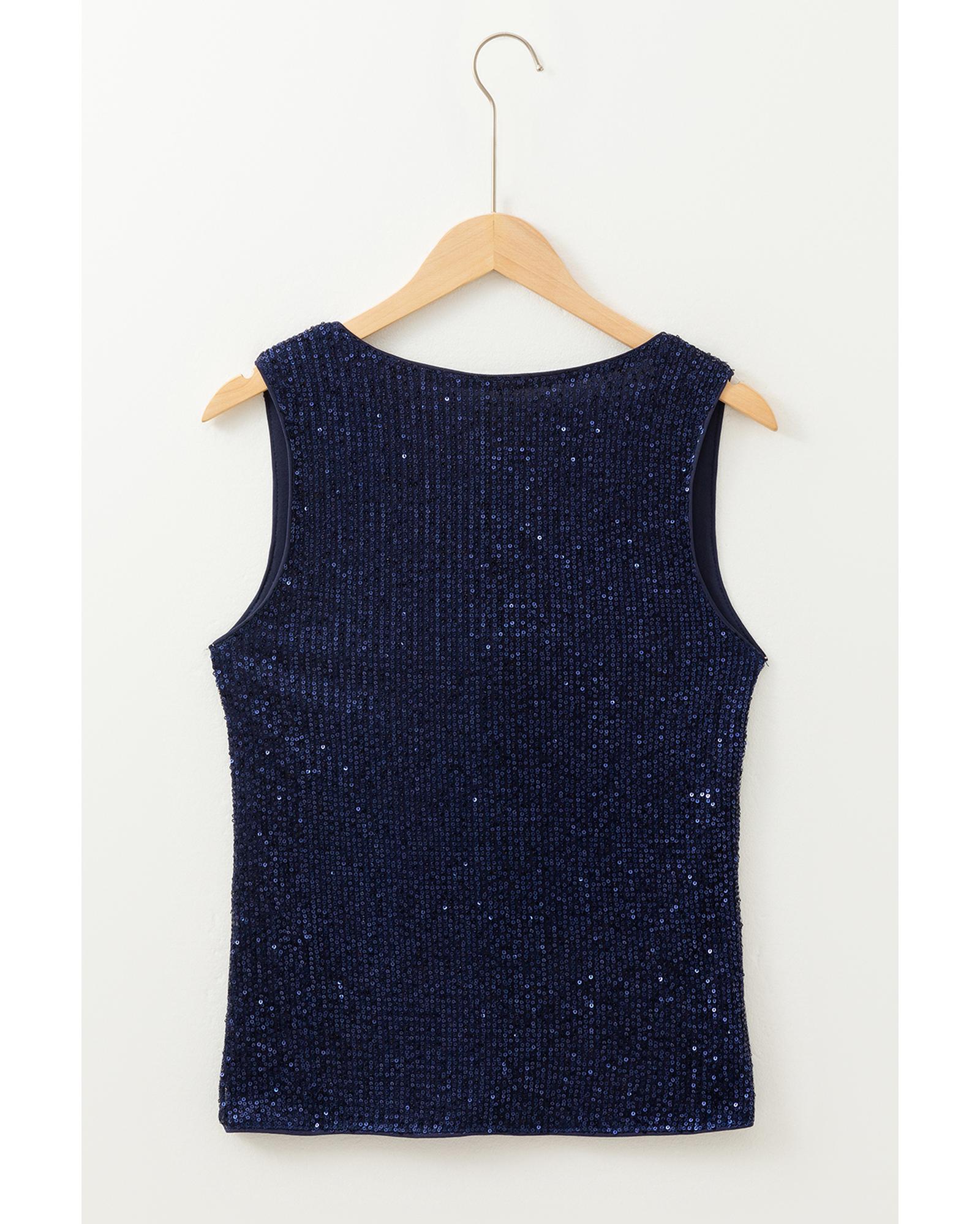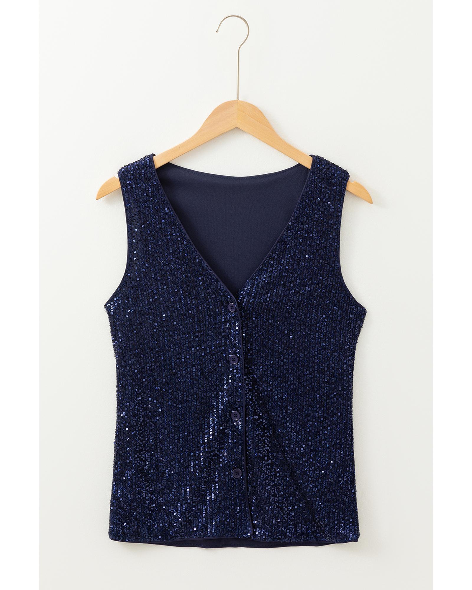 Dirty blue Sequined Deep V Neck Buttoned Tank Top – XL