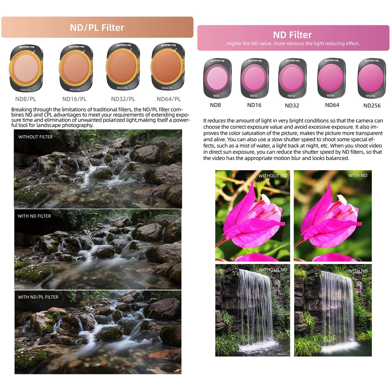 • CPL Filters: Increases colour saturation, creating deep, rich scenic images. Helps to reduce the amount of light entering the lens