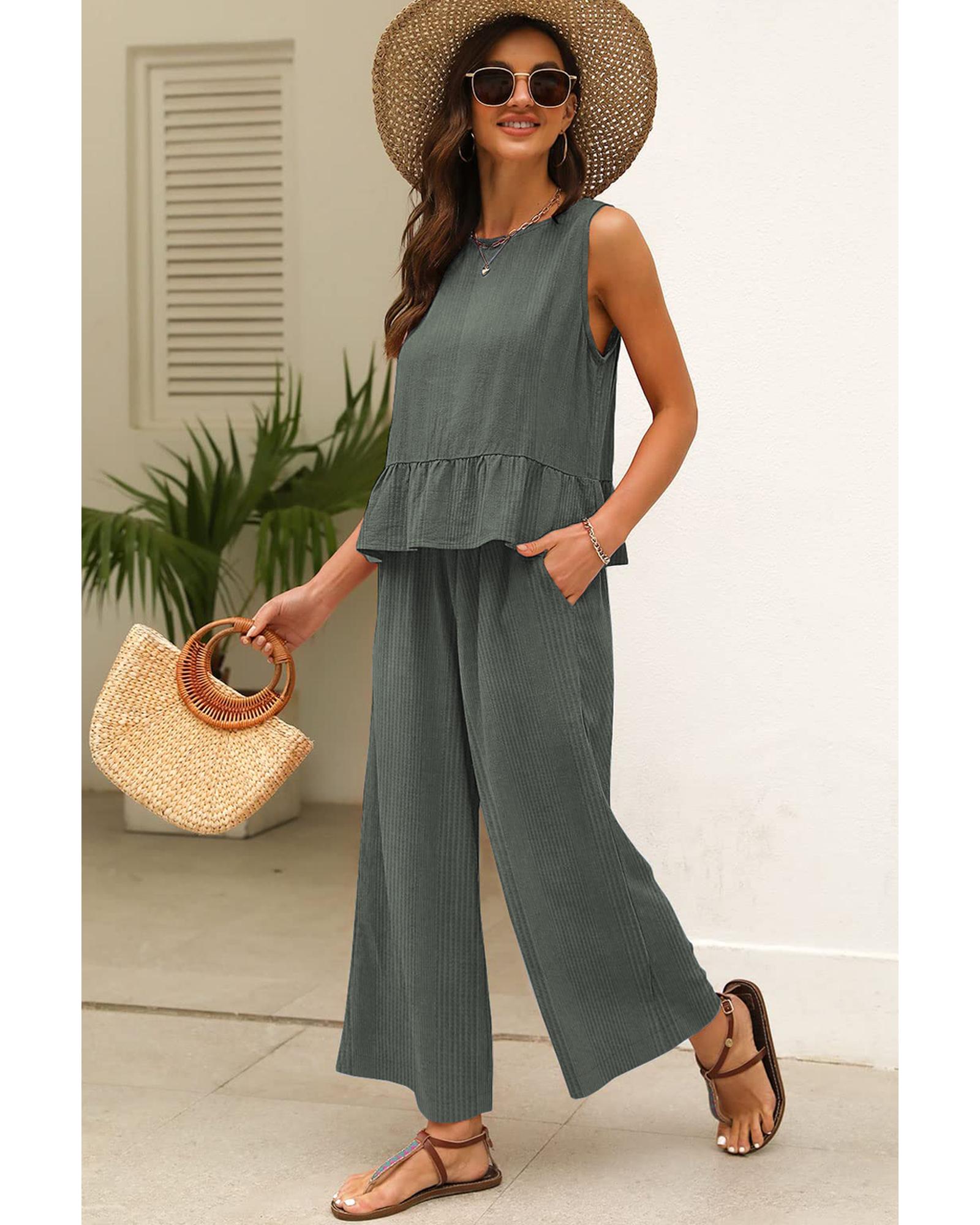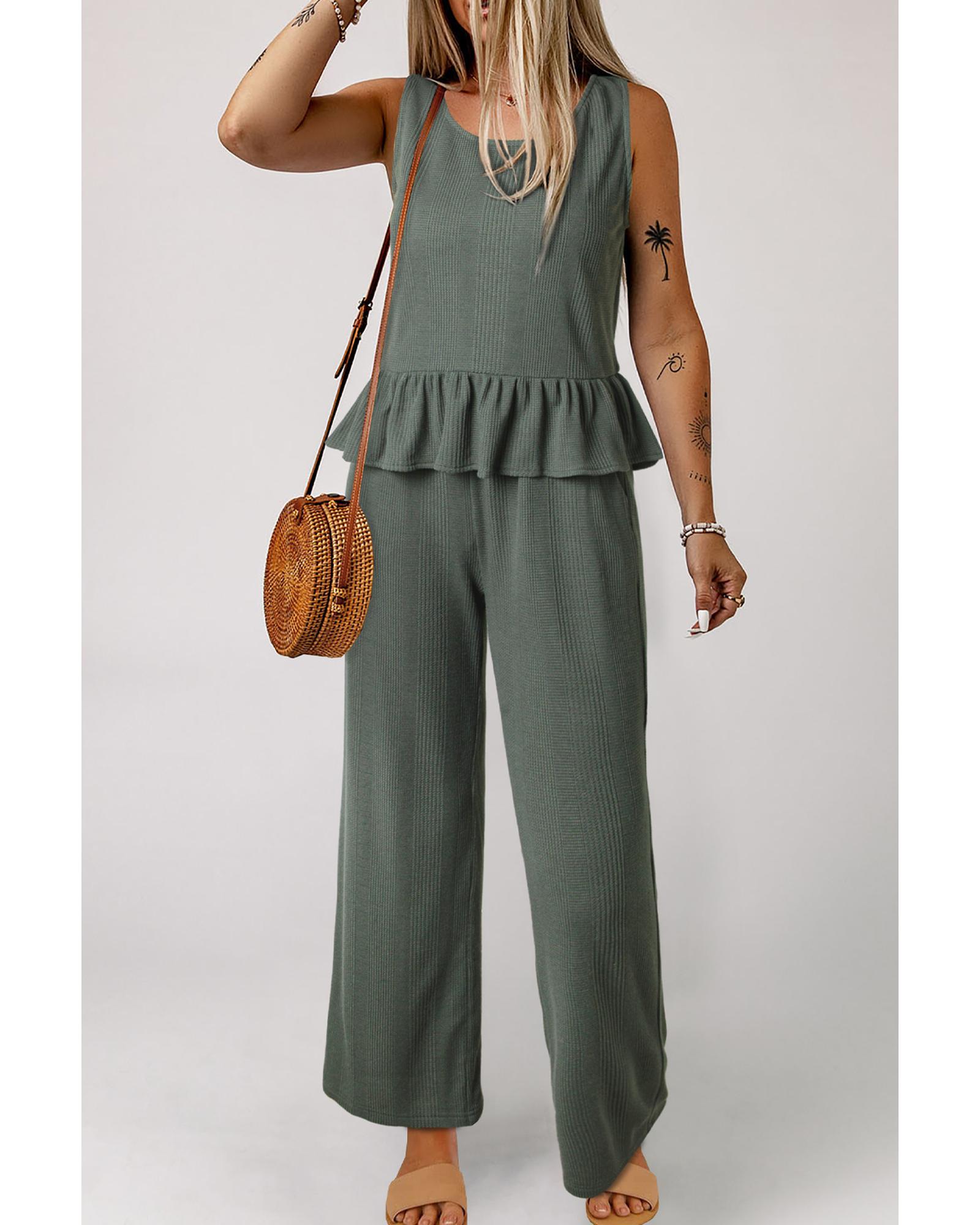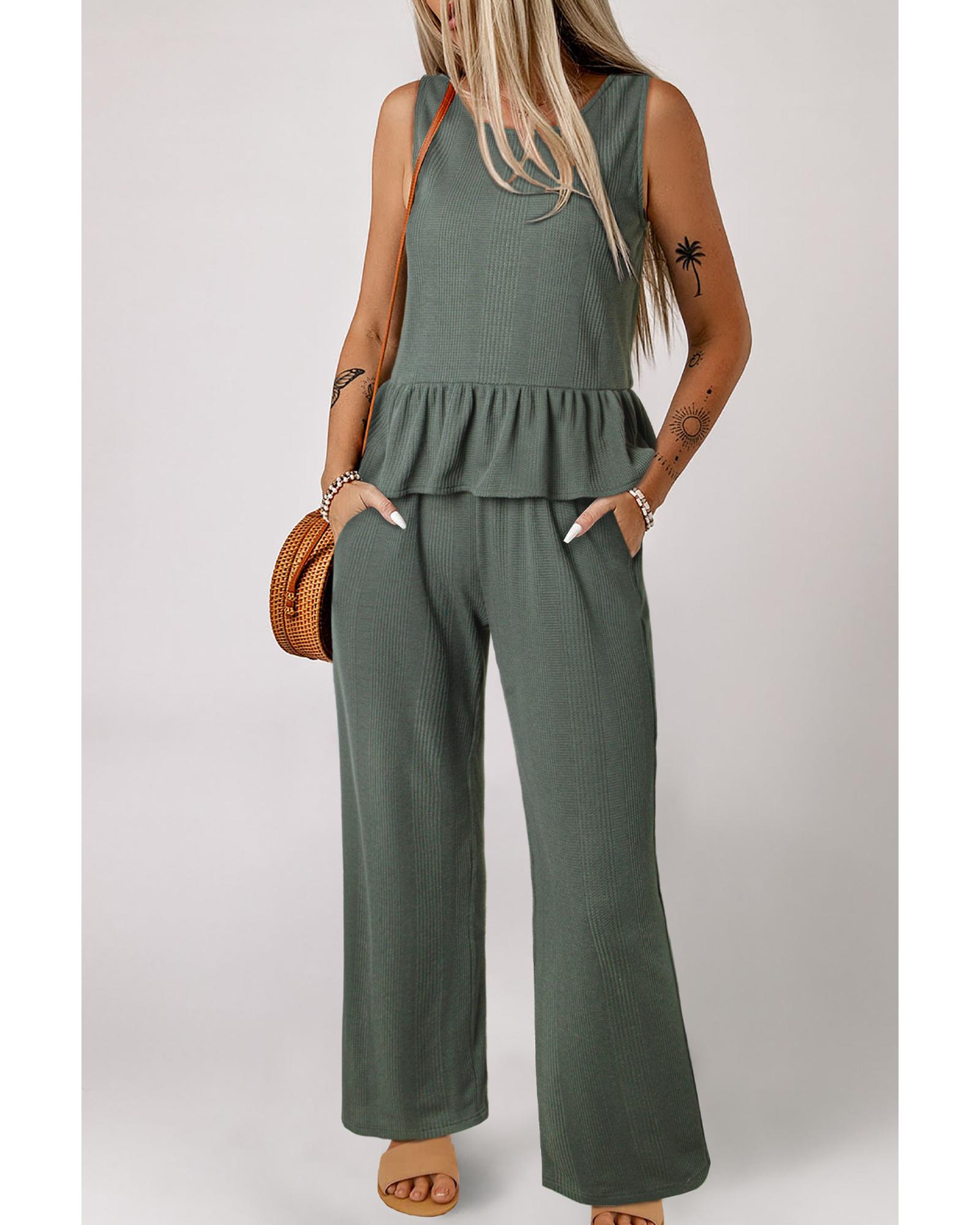 Duffel Green Solid Color Ribbed Ruffle Tank Top and Pants Set – M