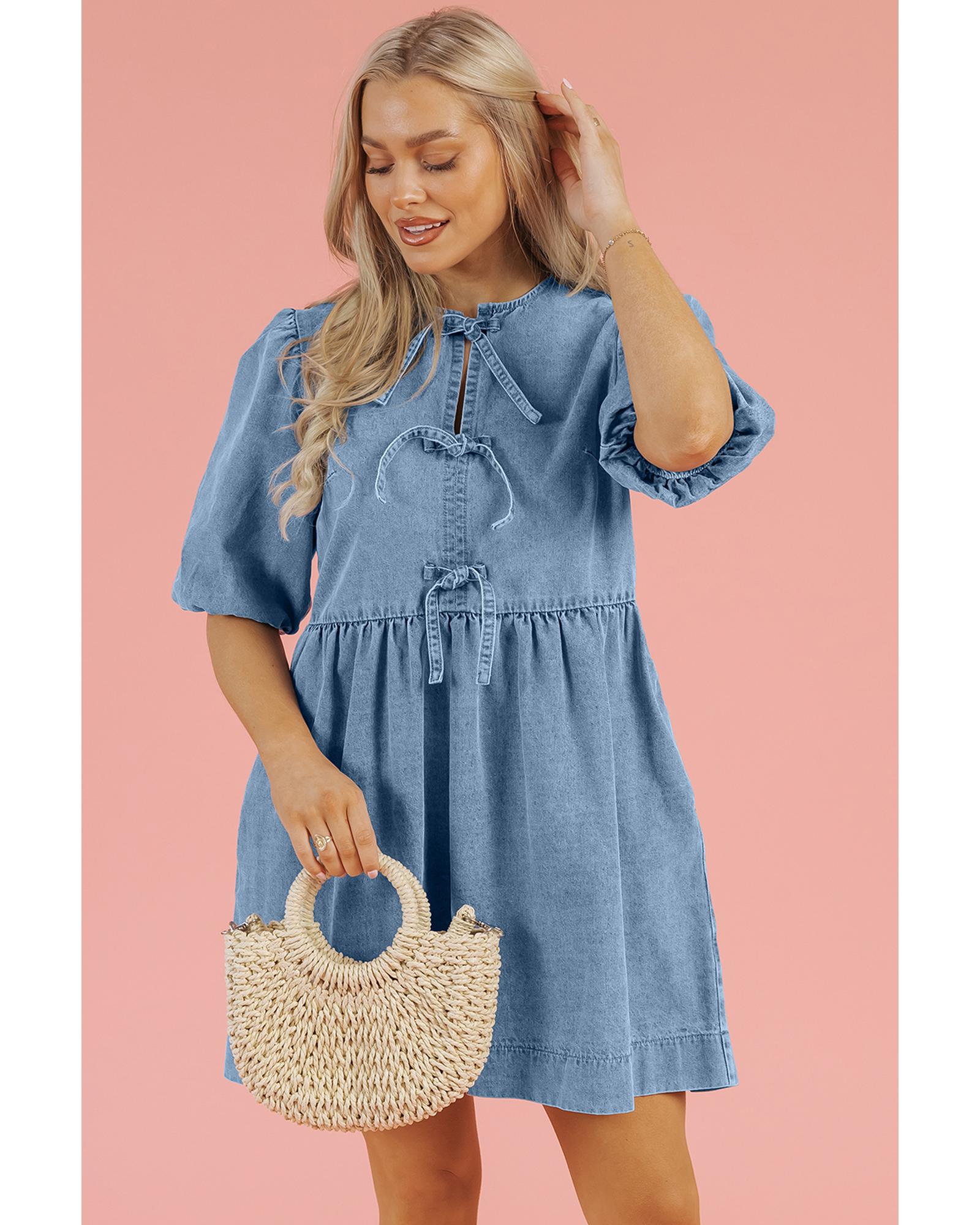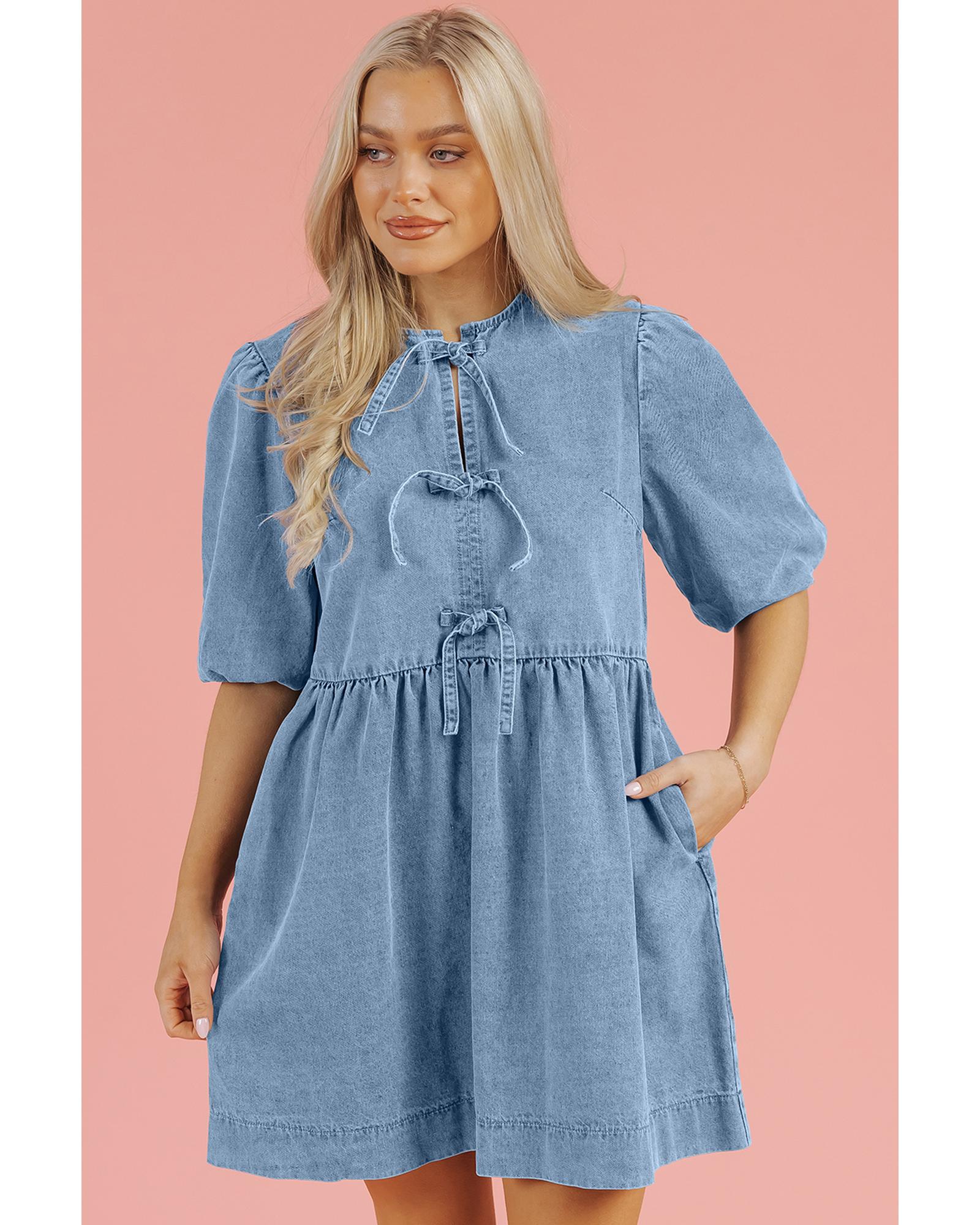 - Dusk Blue Bowknot Bubble Sleeve Short Denim Dress