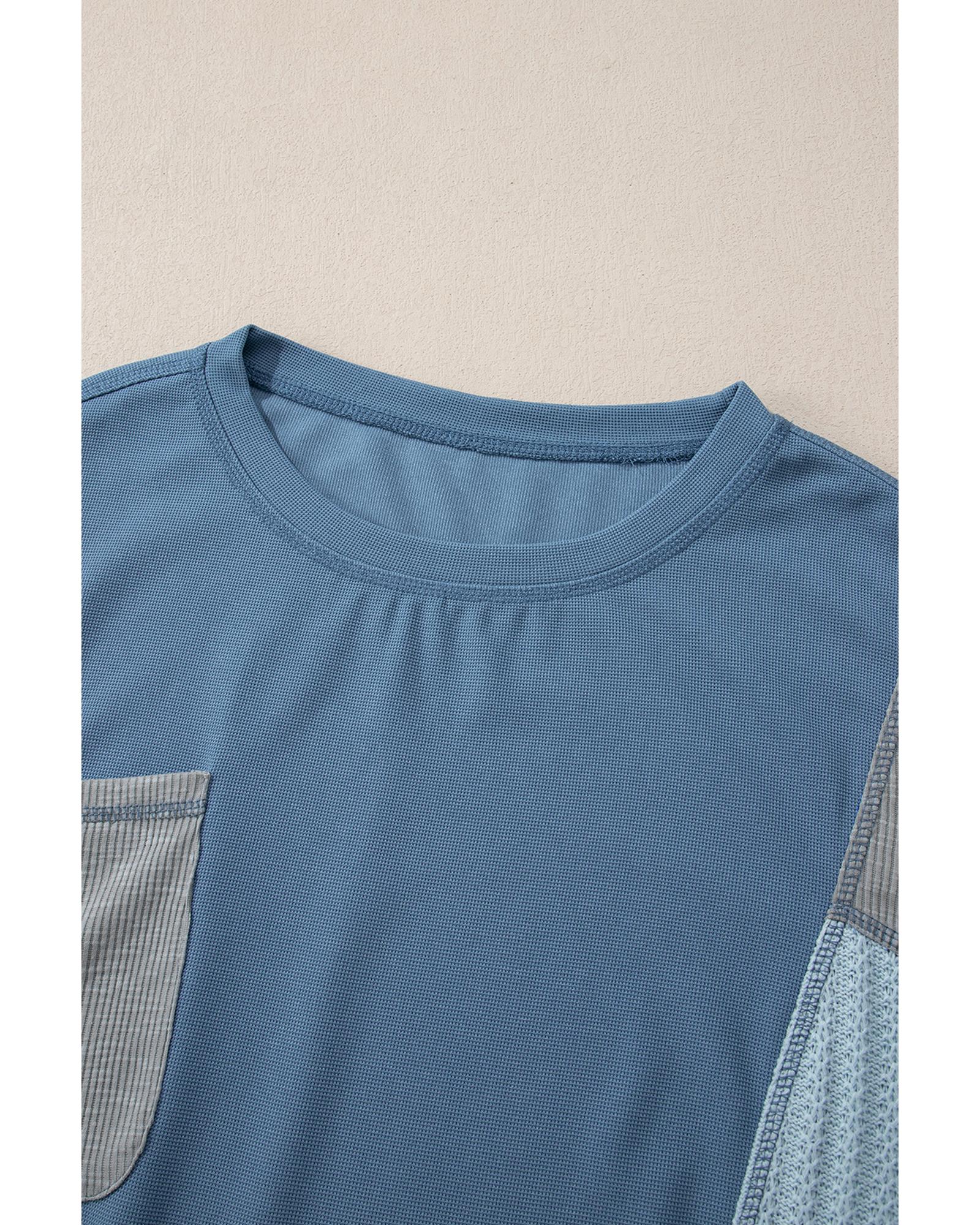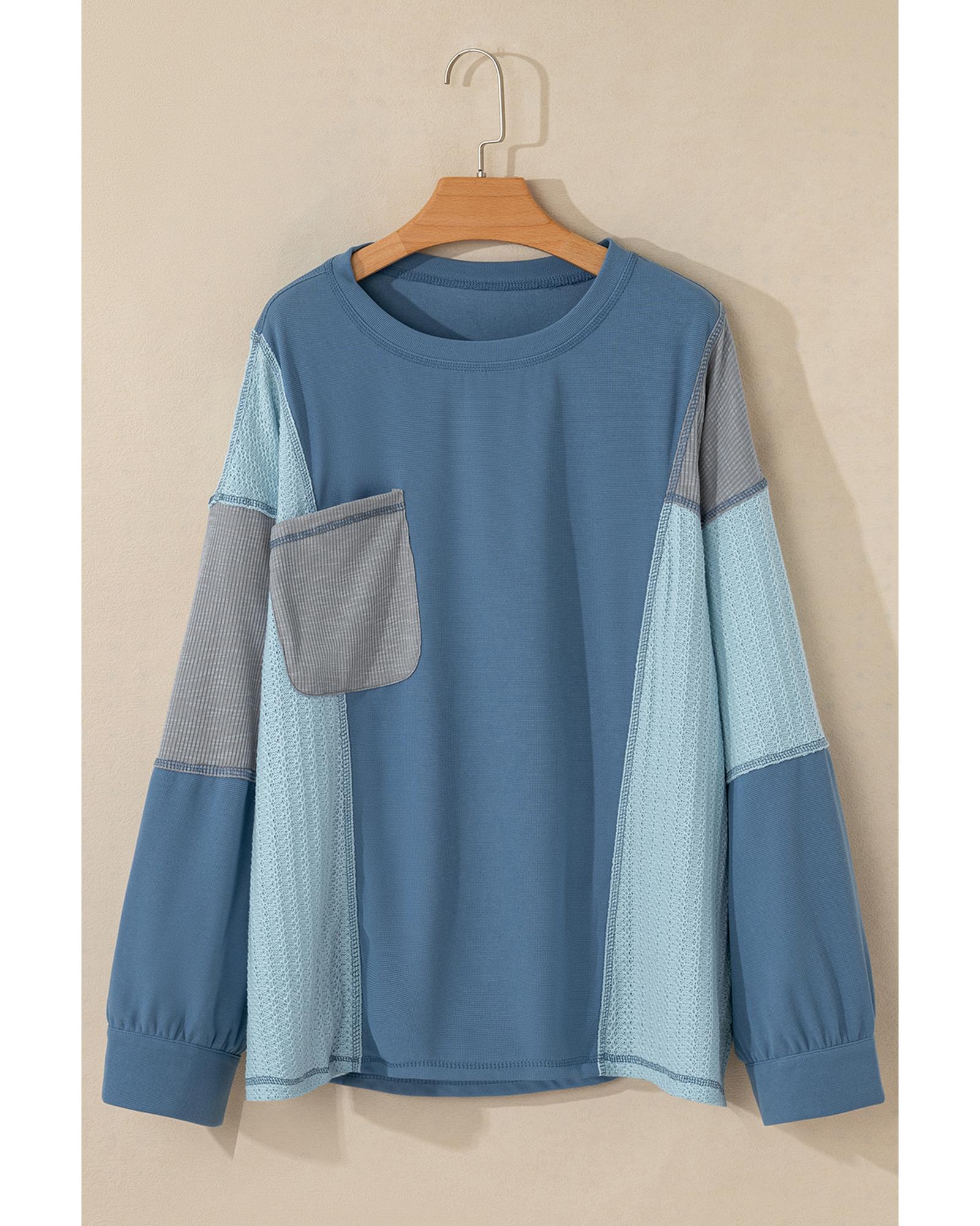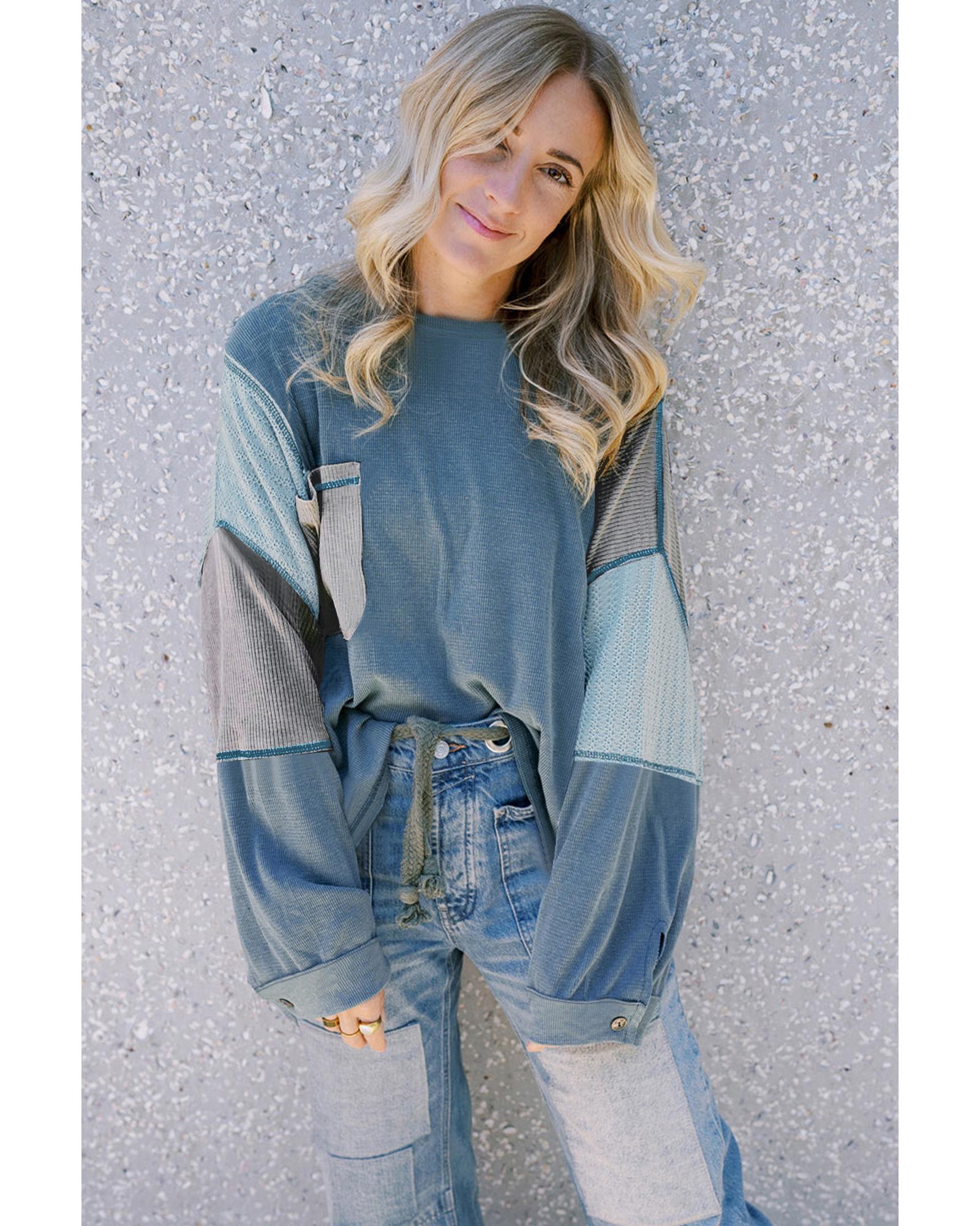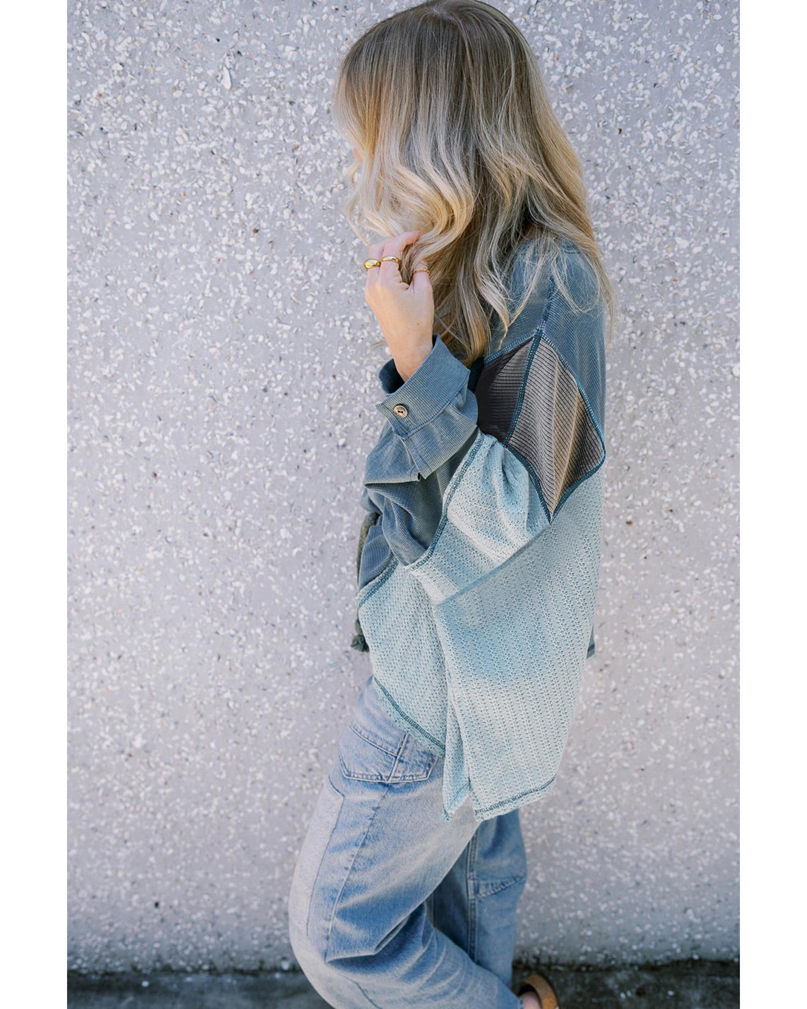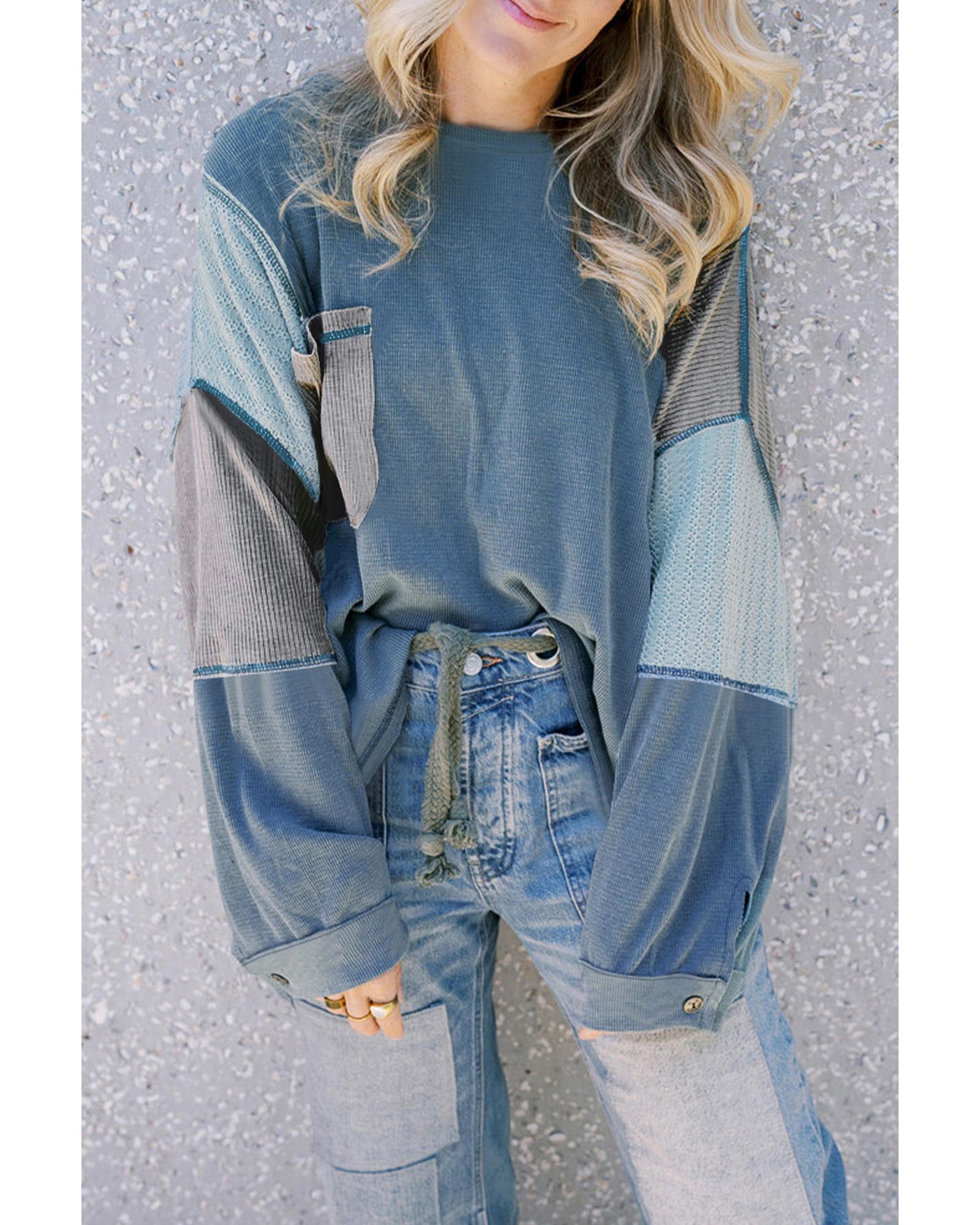 Dusk Blue Colorblock Stitching Patchwork Buttoned Long Sleeve Top – M