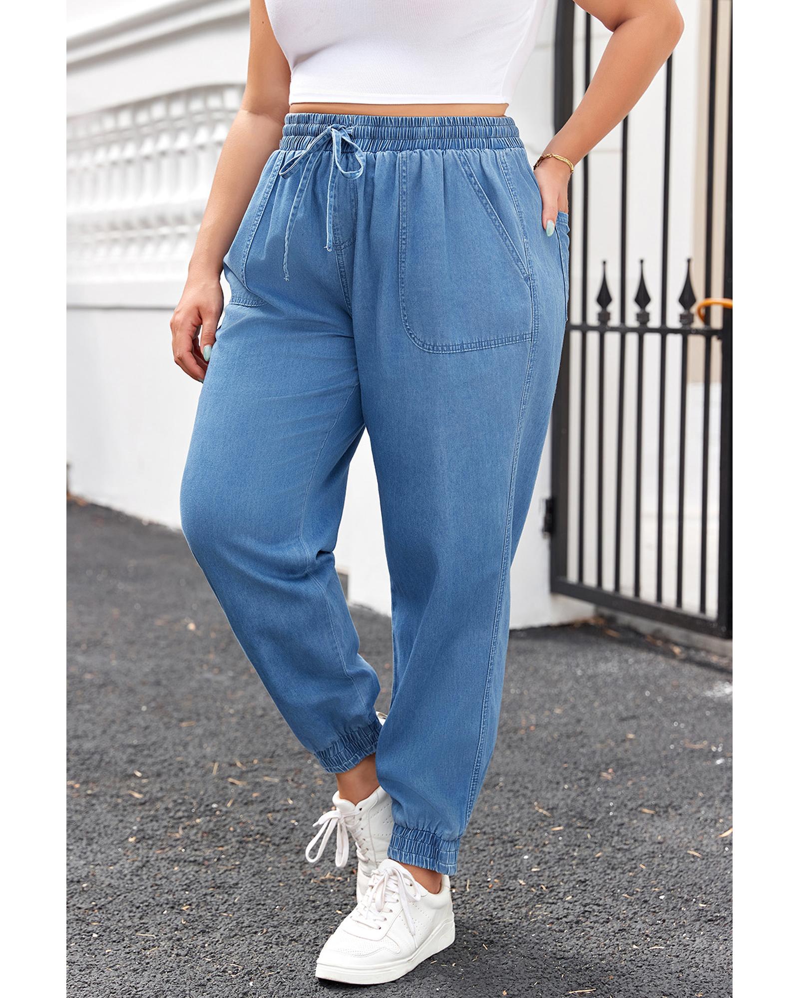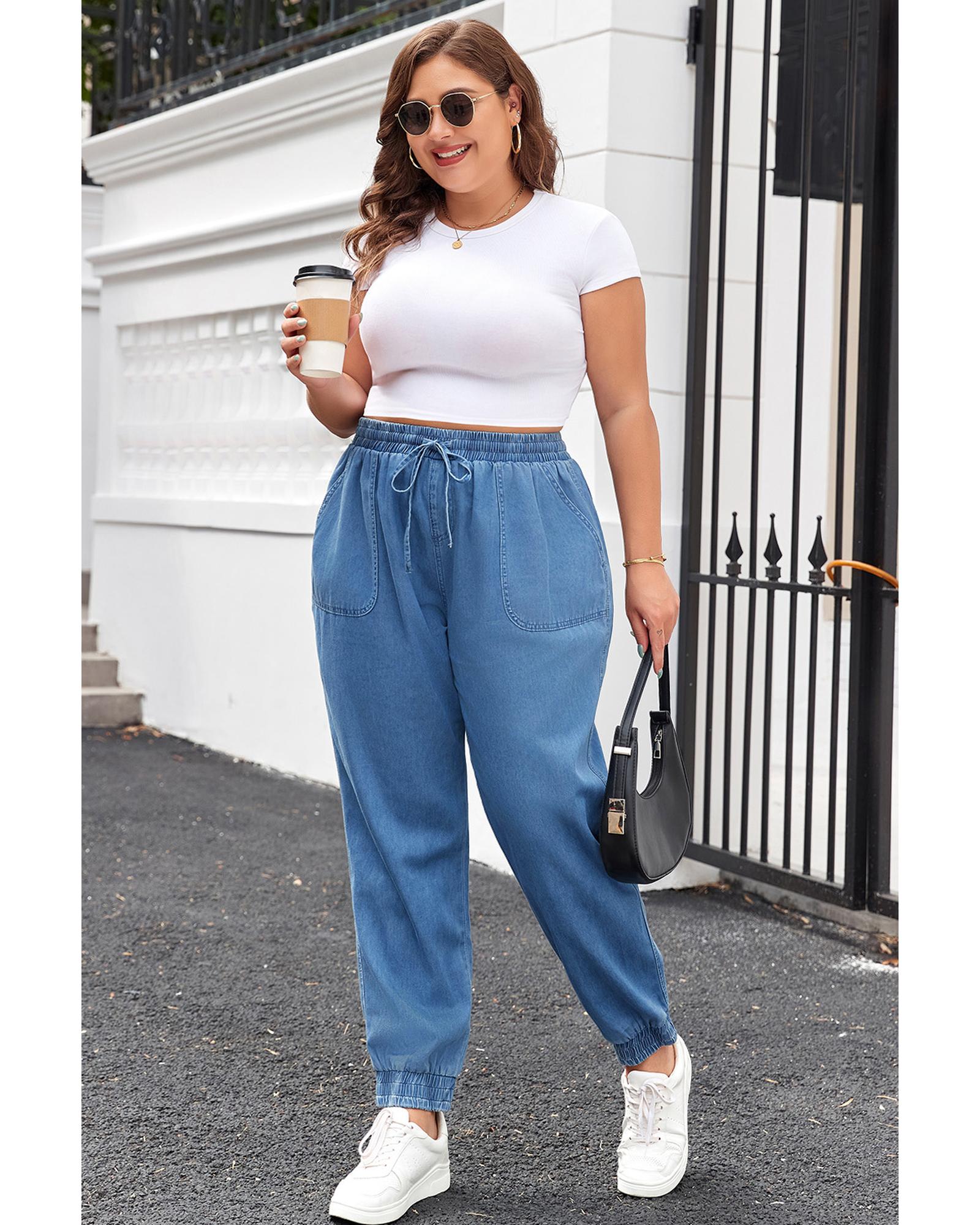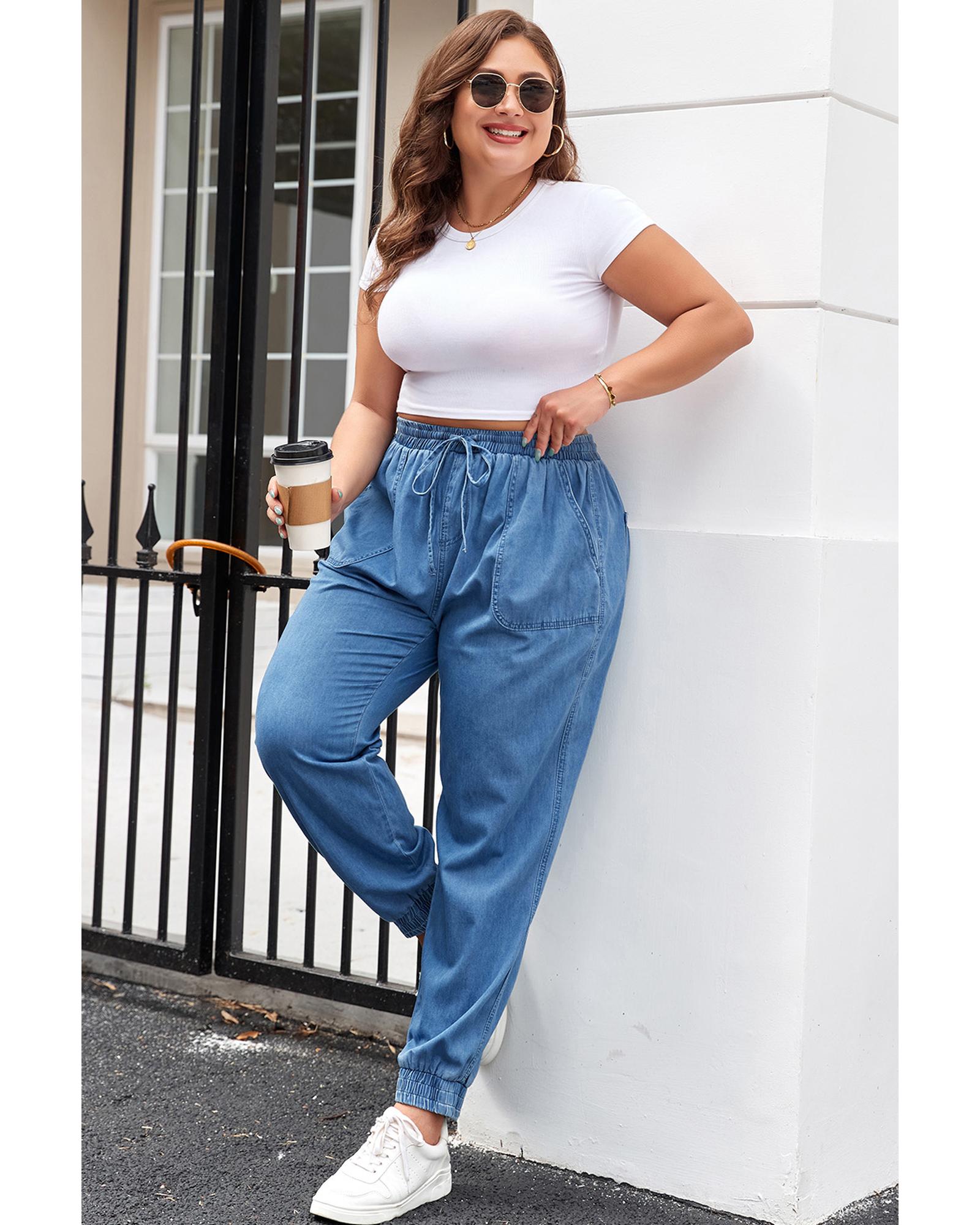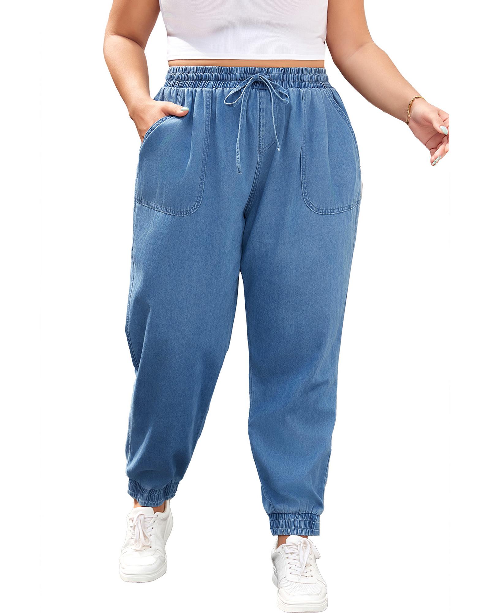 Dusk Blue Drawstring Waist Pocketed Plus Size Denim Joggers - 1X Original price was: $81.99.Current price is: $44.99.