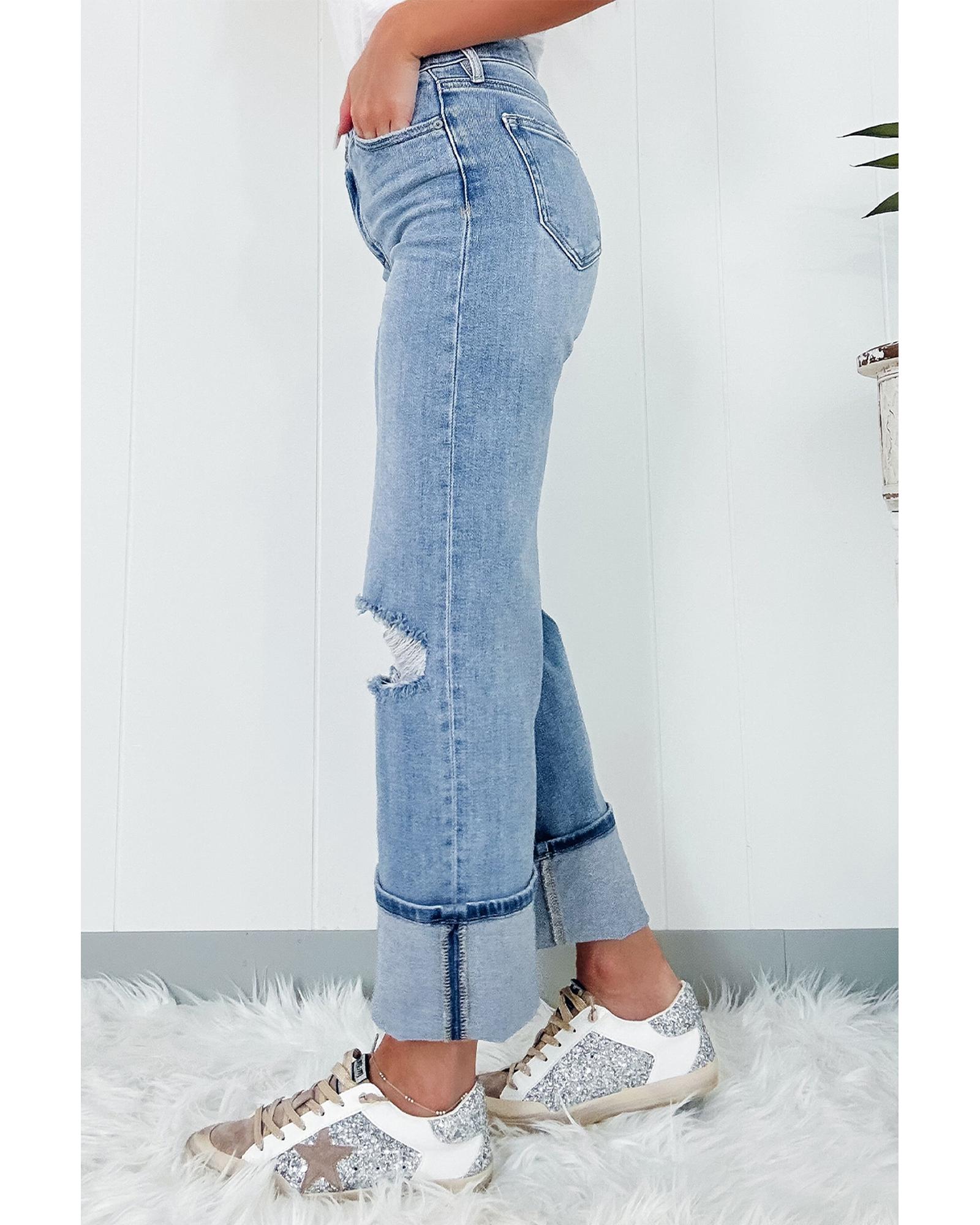 Dusk Blue High Rise Asymmetric Button Zip Fly Ripped Jeans – 16 US