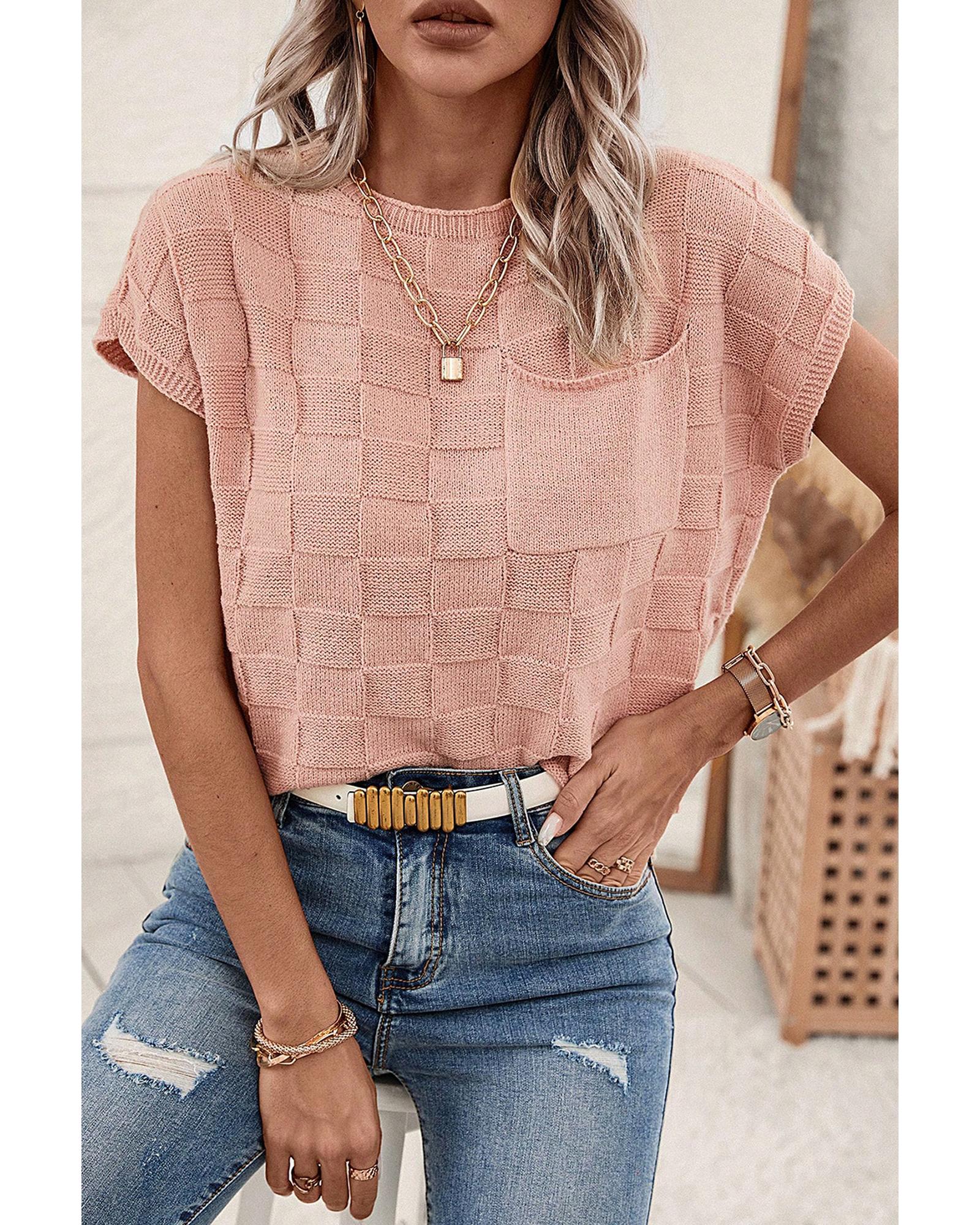 Dusty Pink Lattice Textured Knit Short Sleeve Sweater – XL