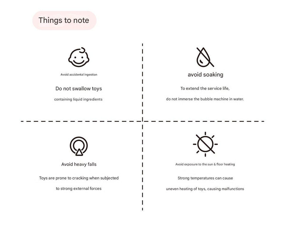 3. Refill Bubble Solution: When the bubble solution is used up, please refill with the manufacturer-provided solution to ensure proper product function. Do not use other self-configured liquids.