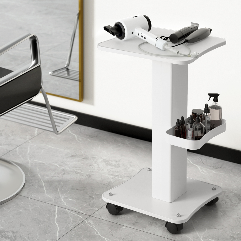 Introducing our sleek Embellir salon trolley: stylish design with lockable wheels for stability, sturdy metal frame, easy maneuverability, ideal for beauty salons seeking practicality and elegance.