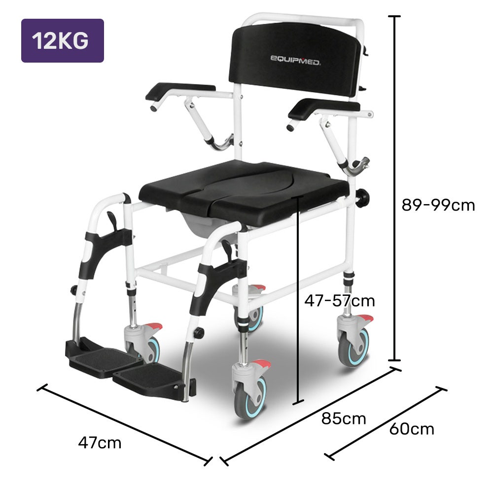 The Equipmed Rolling Commode Toilet Chair is an easy, convenient and practical way to accomplish all of your toileting needs with care and dignity, whether for you or a loved one.