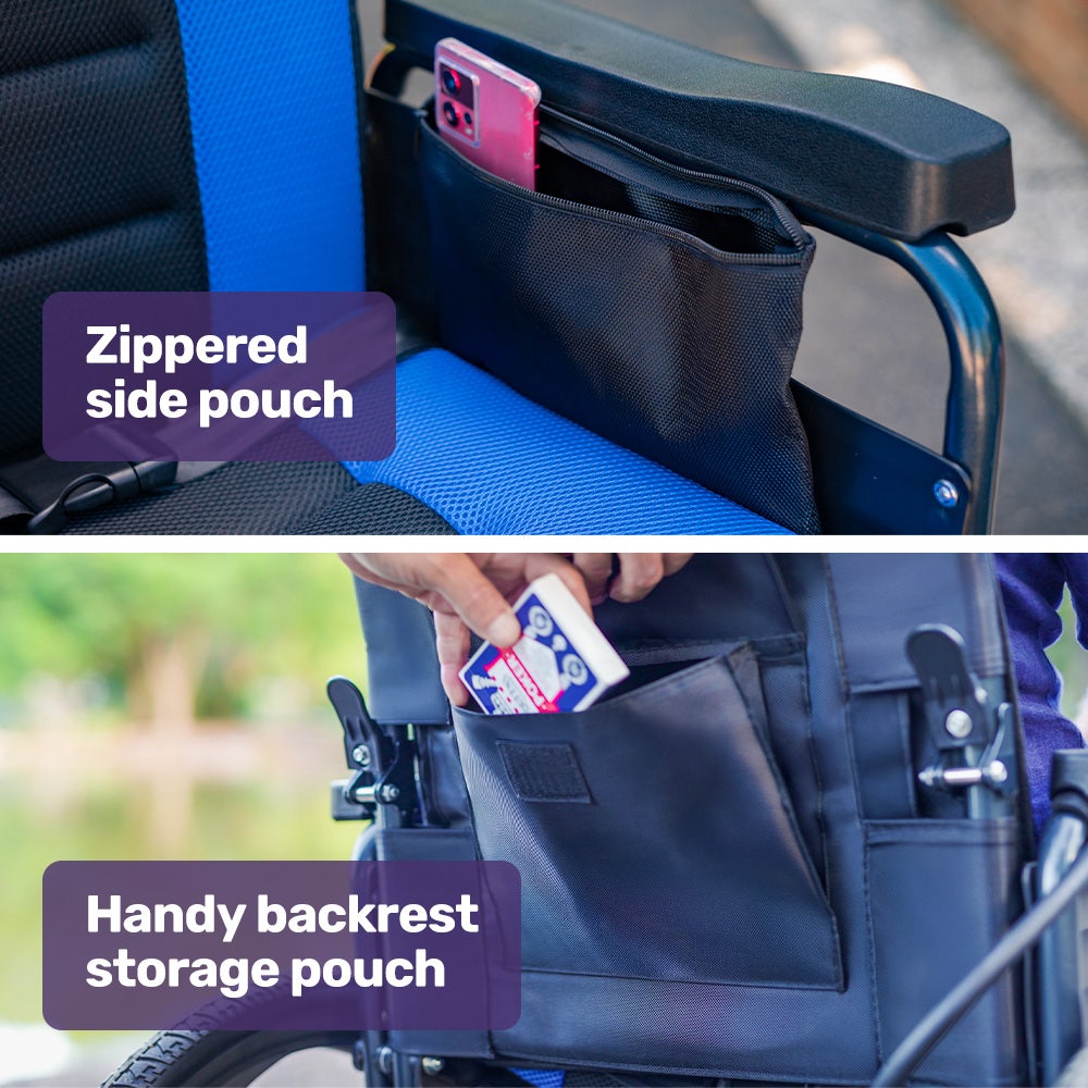 There is a zippered side pocket as well as a reading material pouch behind the backrest. The seat and backrest covers are easily removable and machine washable.