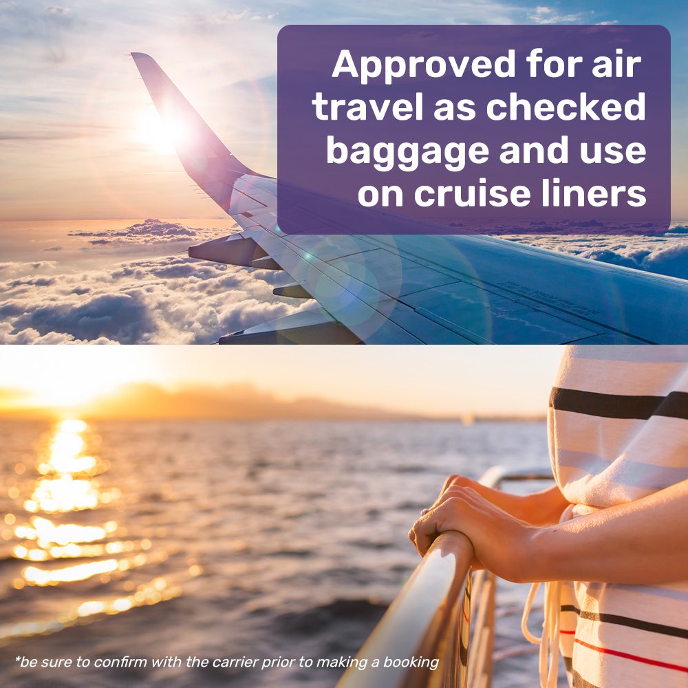 • 288Wh battery capacity is permitted on most Airlines and Cruise Liners (check with them prior to making a booking)