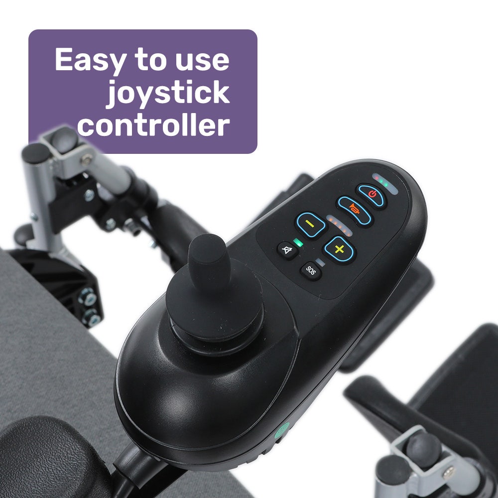 An intuitive joystick keeps control at your fingertips, and flip-up armrests make it easy to sit close to tables. Safety features like automatic electronic brakes, anti-tip wheels, and retractable armrests offer extra security.