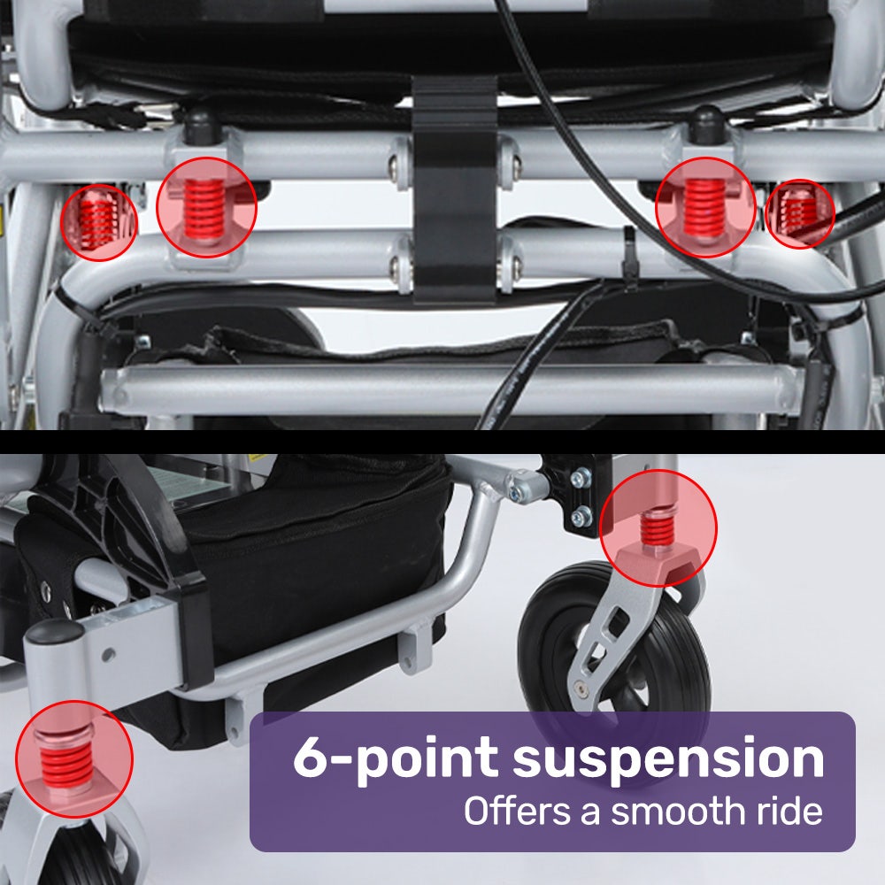 Constructed with a lightweight aluminium frame, its both strong and easy to handle, supporting up to 130kg. The reclining backrest and adjustable leg supports offer custom comfort to fit your needs. With plenty of power from dual motors, it easily tackles hills, winding paths, and tight spaces, with 6 point suspension reducing bumps for a smoother ride.