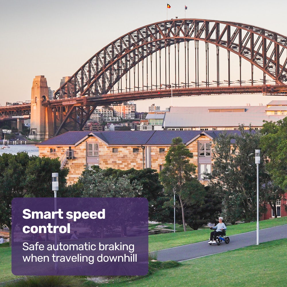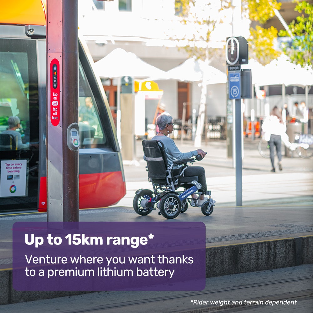 Twin motors offering a total of 500 watts offer an enjoyable riding experience with smooth and responsive performance, not to mention the ability to climb hills and ramps right up to a 15-degree incline! A tight 1m turning circle offers the manoeuvrability you need on paths and in places like shopping centres and airports.