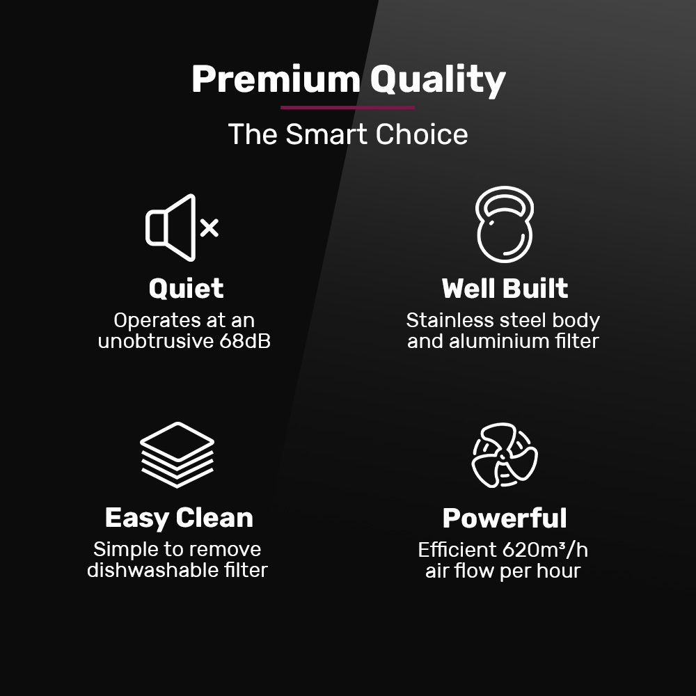 The EuroChef Undermount Rangehood seamlessly blends into your kitchen with its sleek, discreet design. Made from 410 grade stainless steel, it’s built to last, while the 184W motor and 620m³/h airflow efficiently clear smoke and odours.