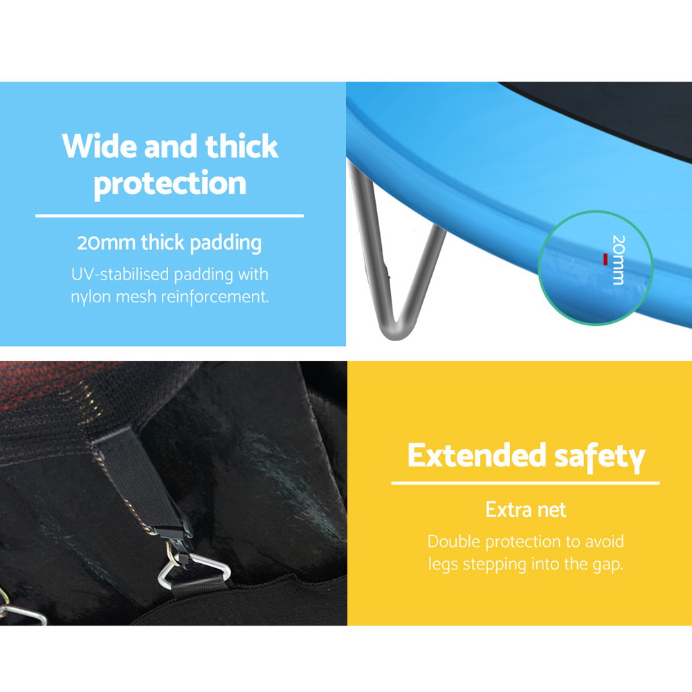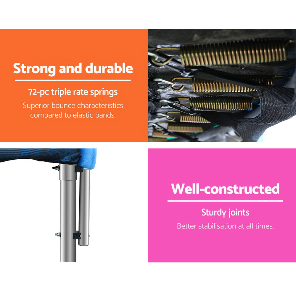 Bounce to your heart’s content with our Trampoline. With its superior bounce characteristics featuring 72-piece triple rate springs, the 12-foot trampoline enables safe and durable bouncing with no worries. The heavy-gauge steel framework is designed to handle all robust play and is UV-tested for quality and reliability. Other great features include 8 posts for strong support, 20mm thick padding, anti-graze mat, safety netting and a double-lock zip-and-clip entry. So jump to it and order our trampoline today.