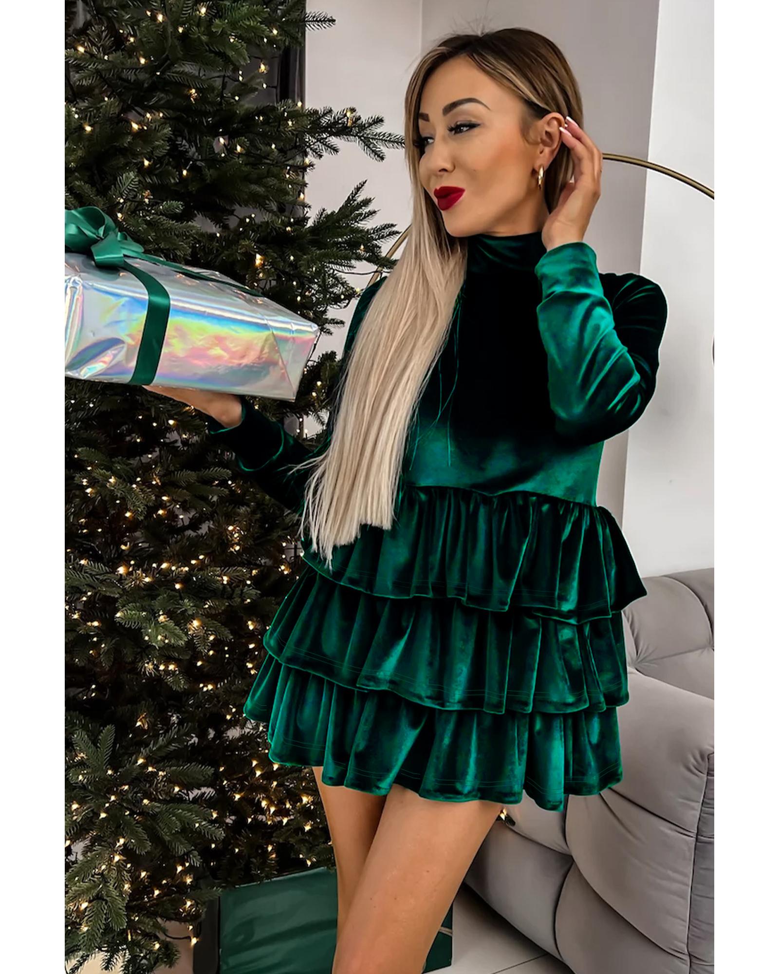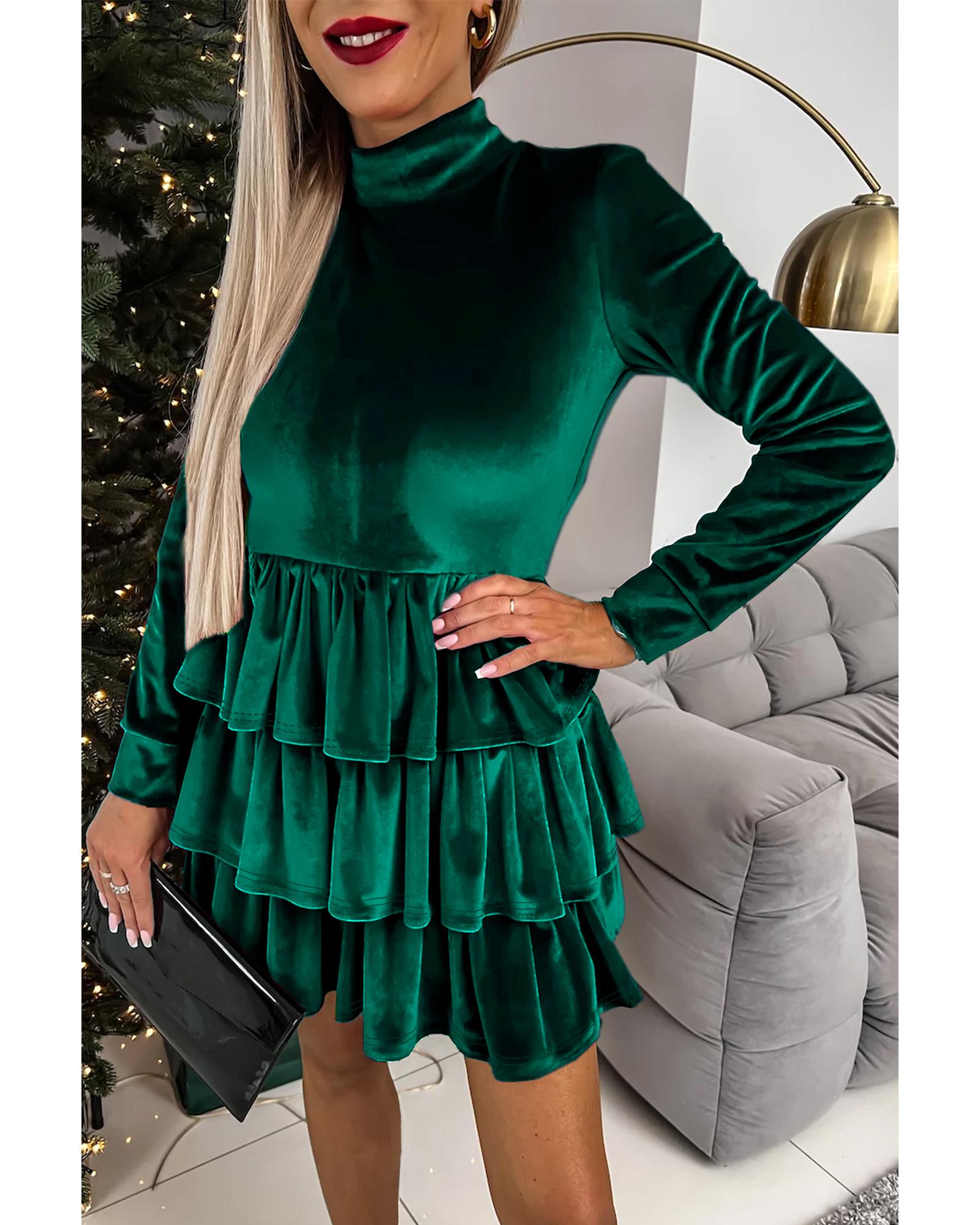 Evergreen Velvet High Neck Tiered Ruffle Mini Dress – XL