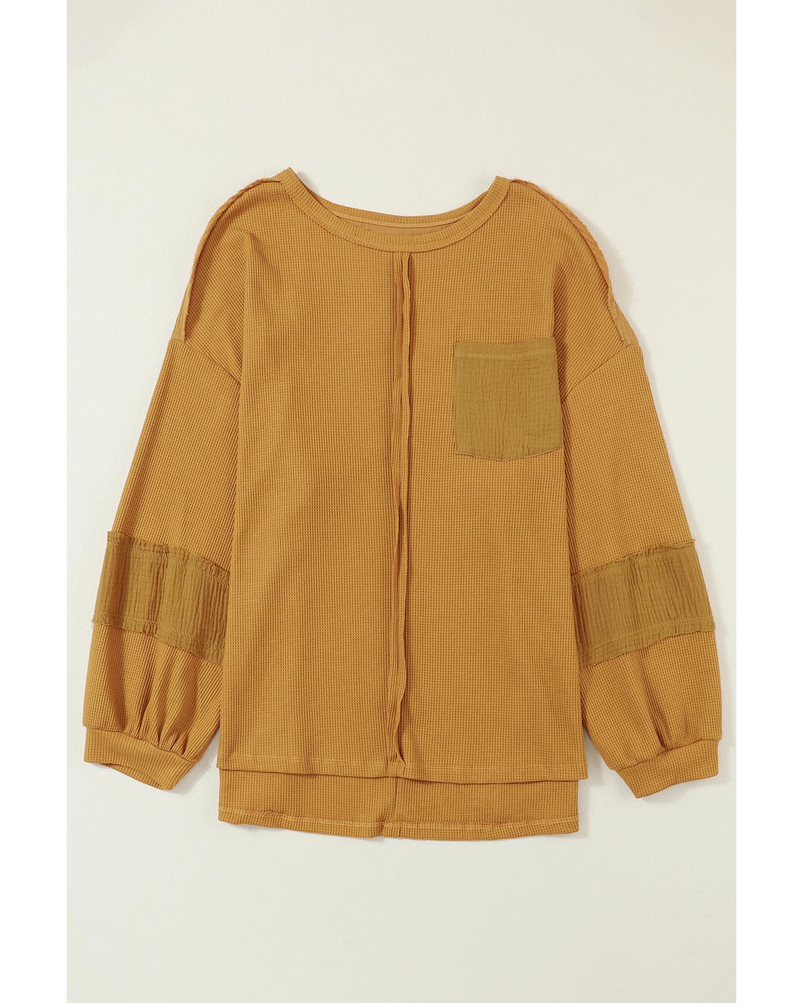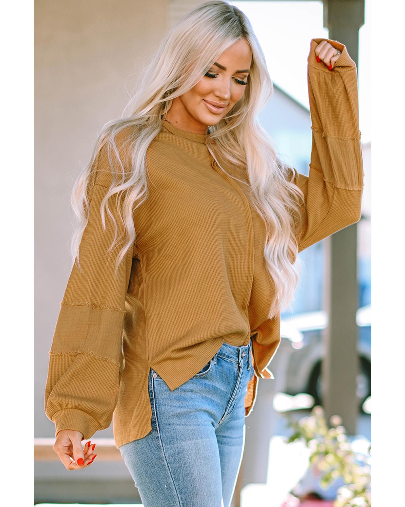 Exposed Seam Patchwork Bubble Sleeve Waffle Knit Top – L