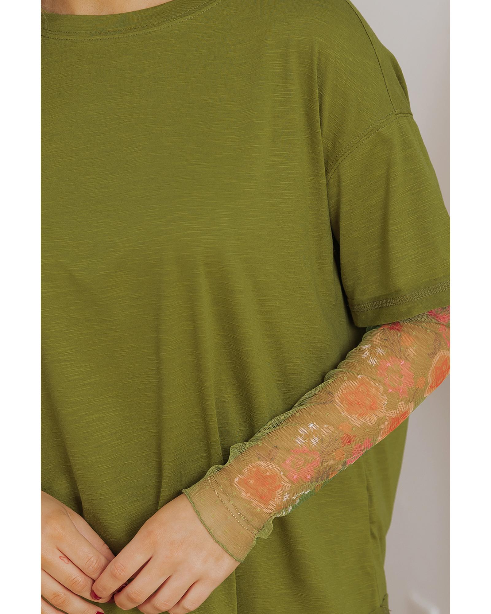 - Fern Green Faux Two Piece Floral Long Sleeve Patchwork Tee