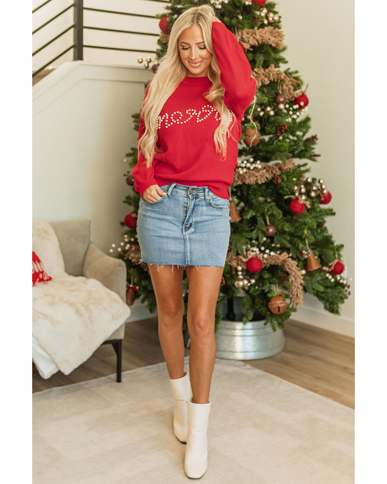 Fiery Red Pearl Beaded Merry Casual Sweater – S