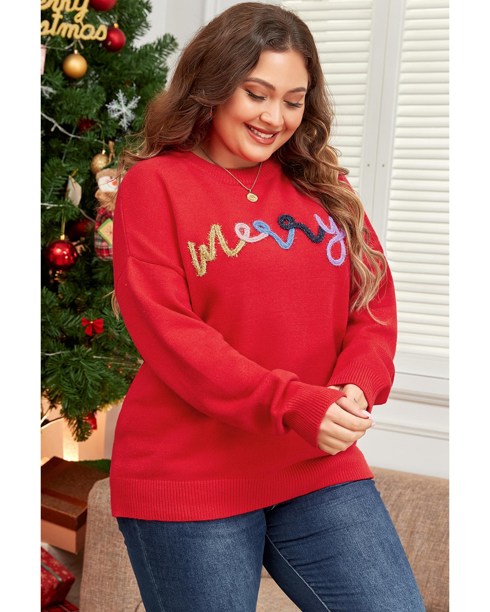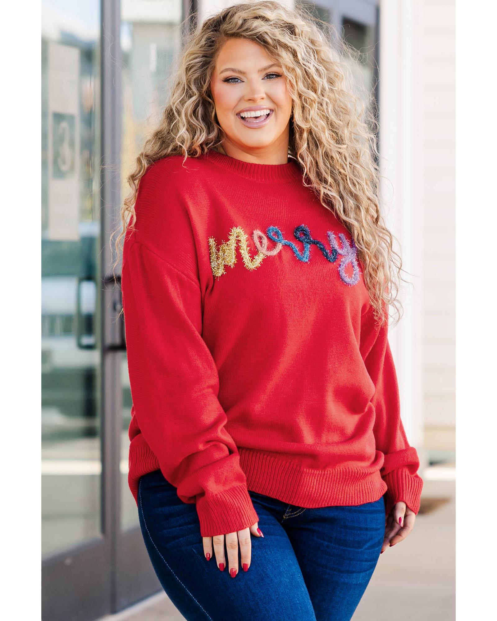 Fiery Red Tinsel merry Pattern Drop Shoulder Plus Size Sweater – 1X