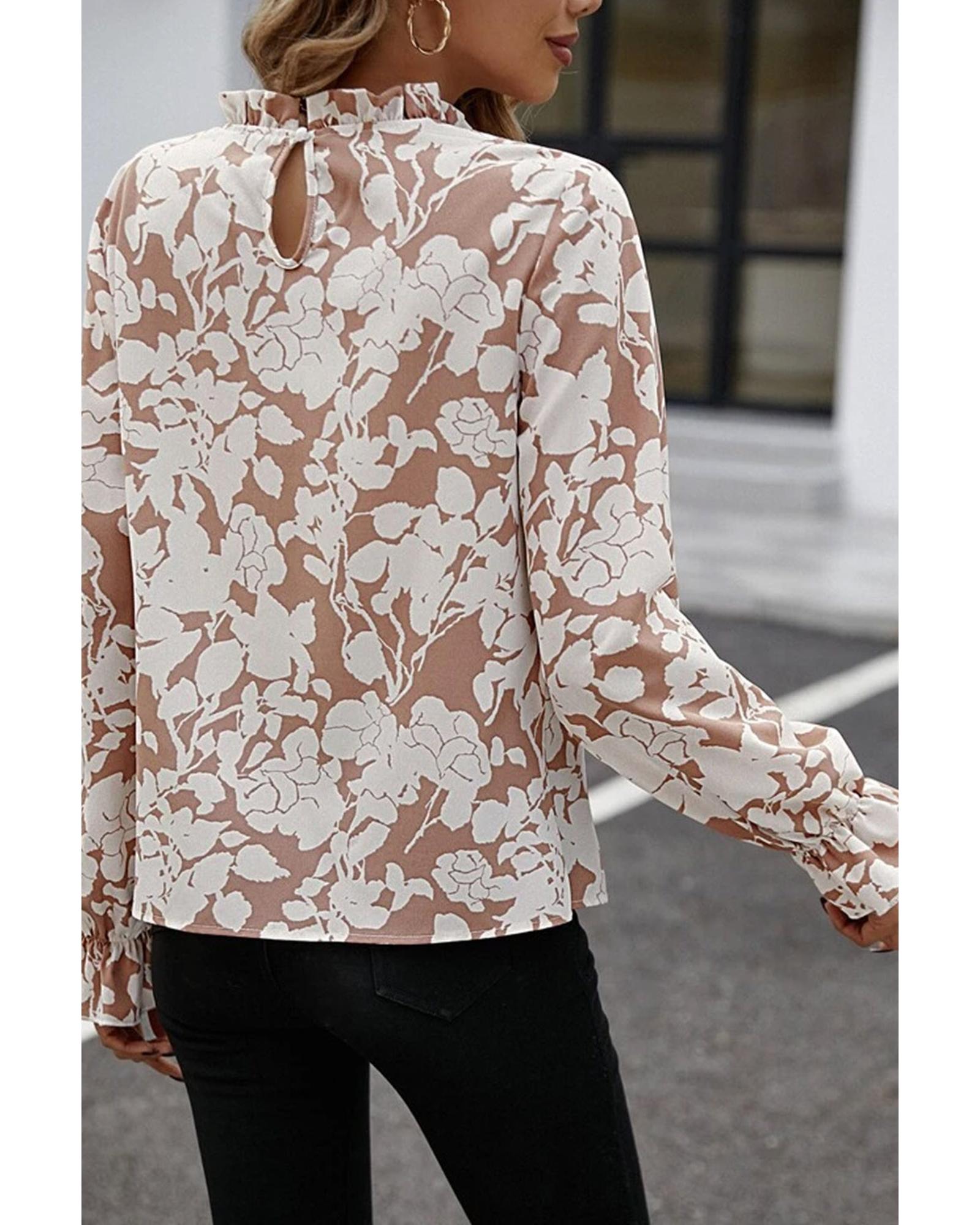 Flaxen Floral Print Frilled Neckline Flounce Sleeve Blouse – S