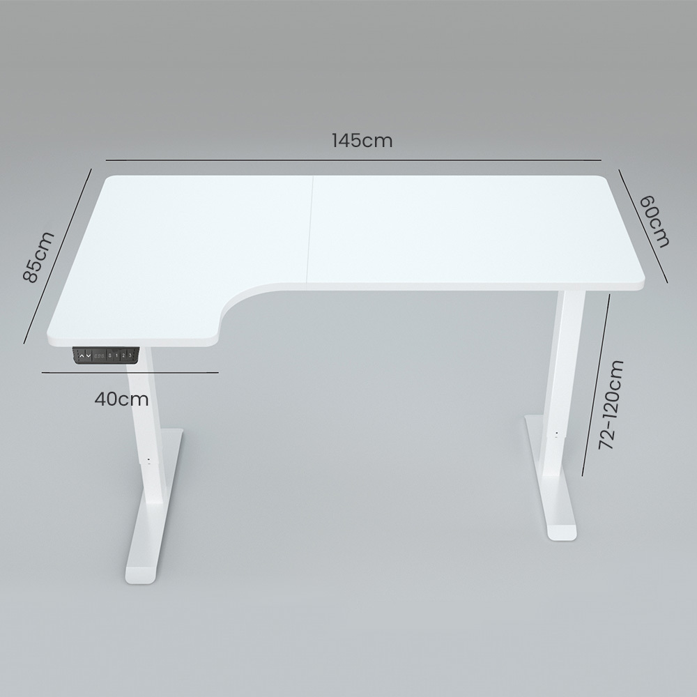 FORTIA 145W x 60D x 85D Dual-Motor 80kg Load Adjustable Sit-Stand Up L-Hand Sided Corner Desk – White/White Frame