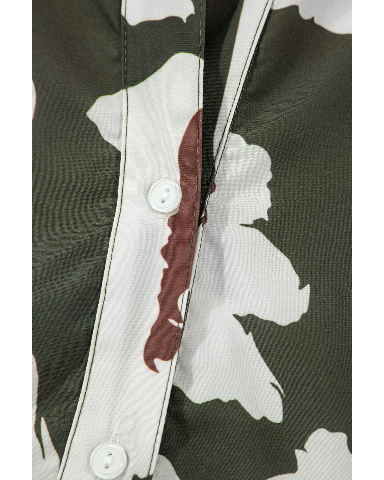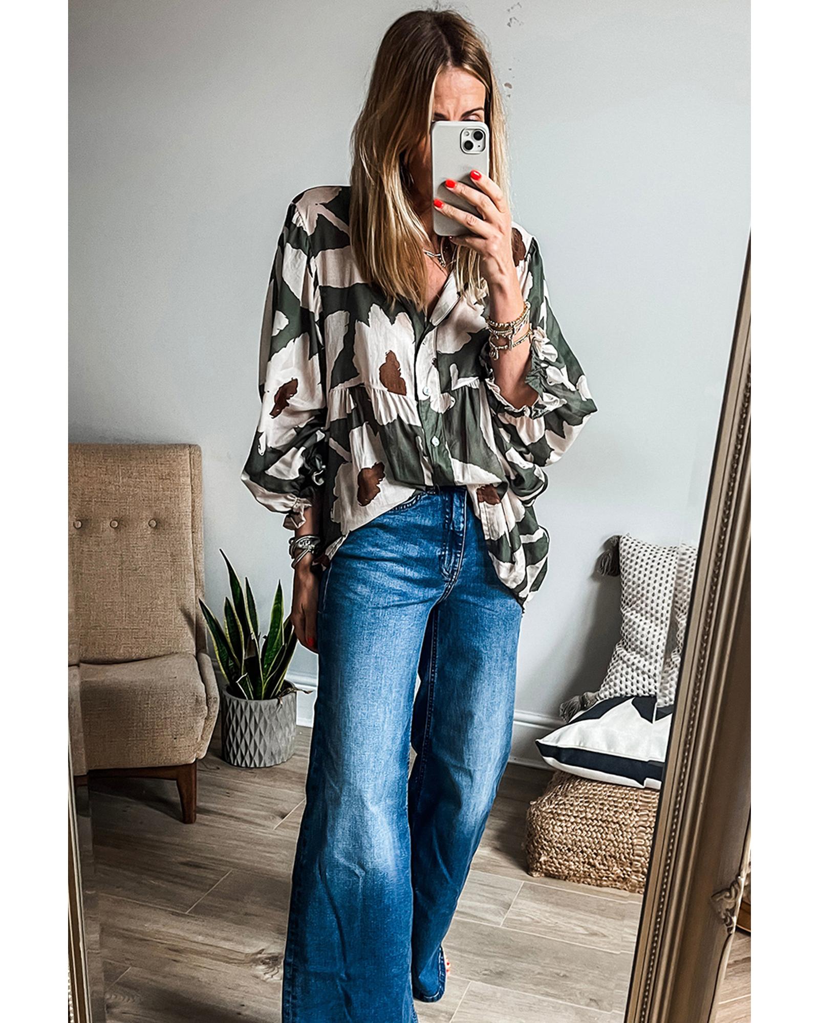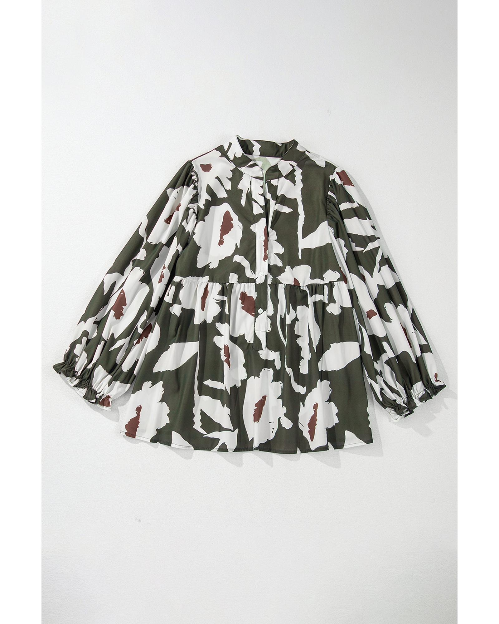 Four Leaf Clover Abstract Floral Print Puff Sleeve Half Button Blouse – XL