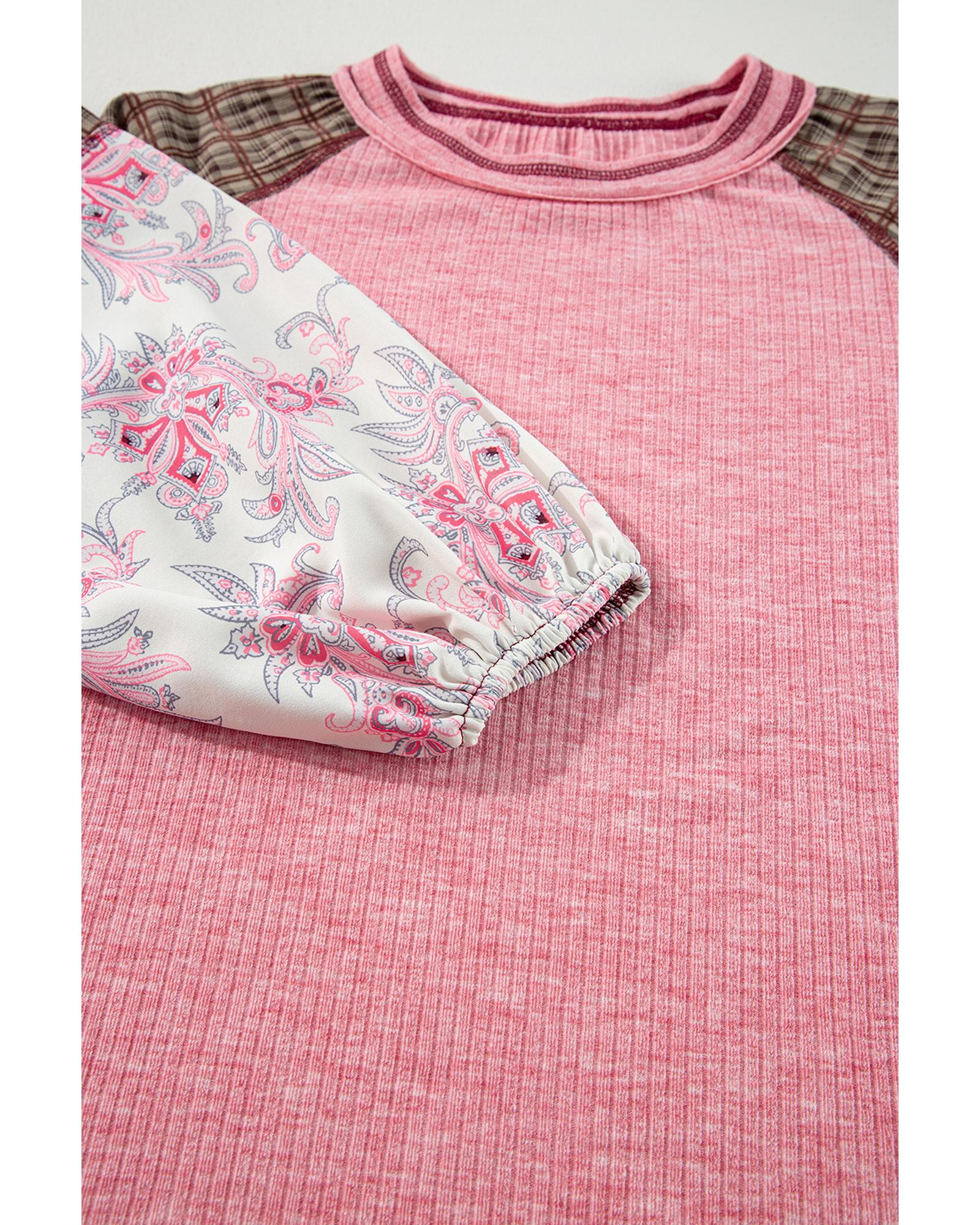 Fushia Mixed Print Raglan Sleeve Ribbed Knit Patchwork Blouse – L