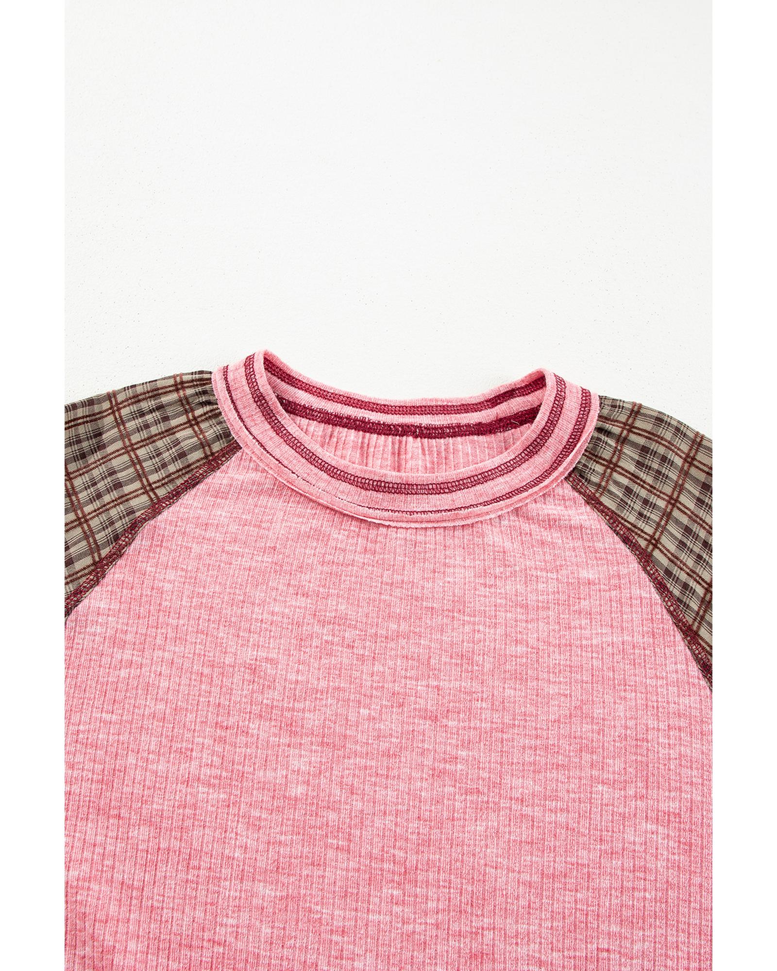 Fushia Mixed Print Raglan Sleeve Ribbed Knit Patchwork Blouse – S