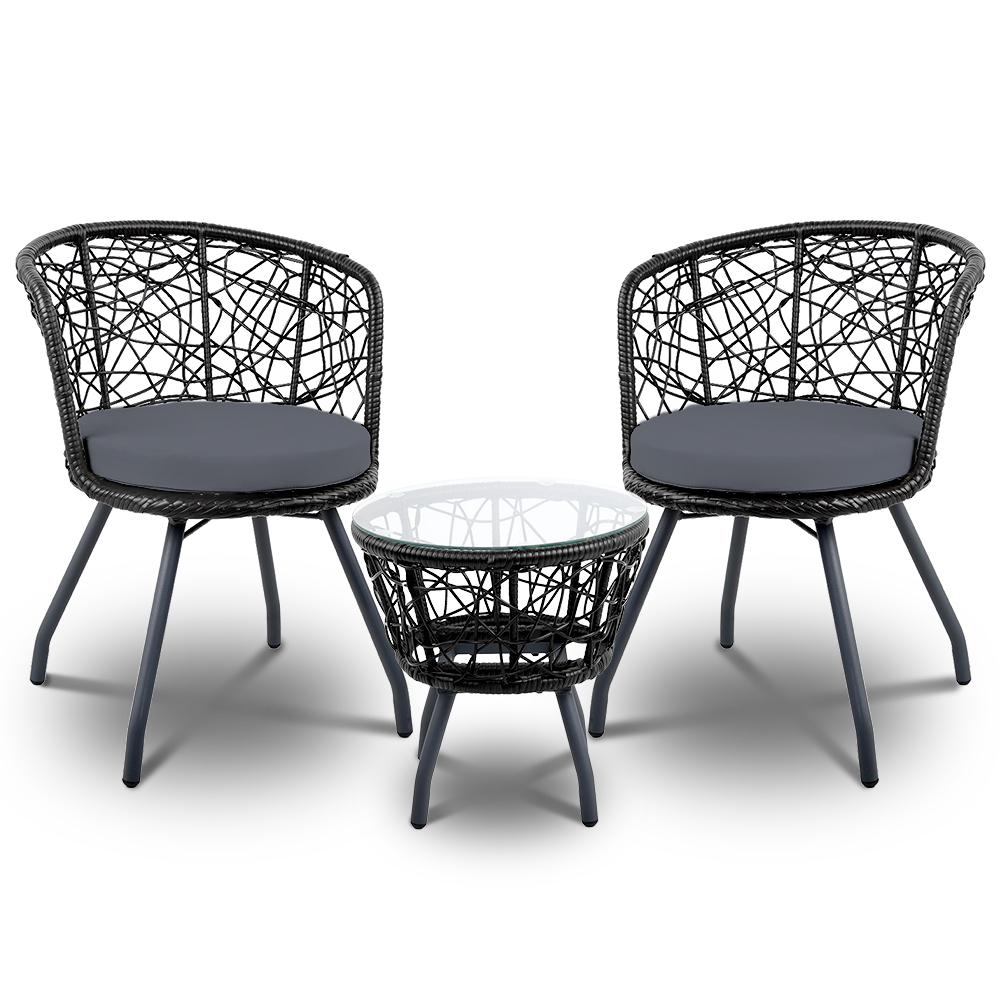 Gardeon 3PC Bistro Set Outdoor Furniture Rattan Table Chairs Patio Garden Cushion Black