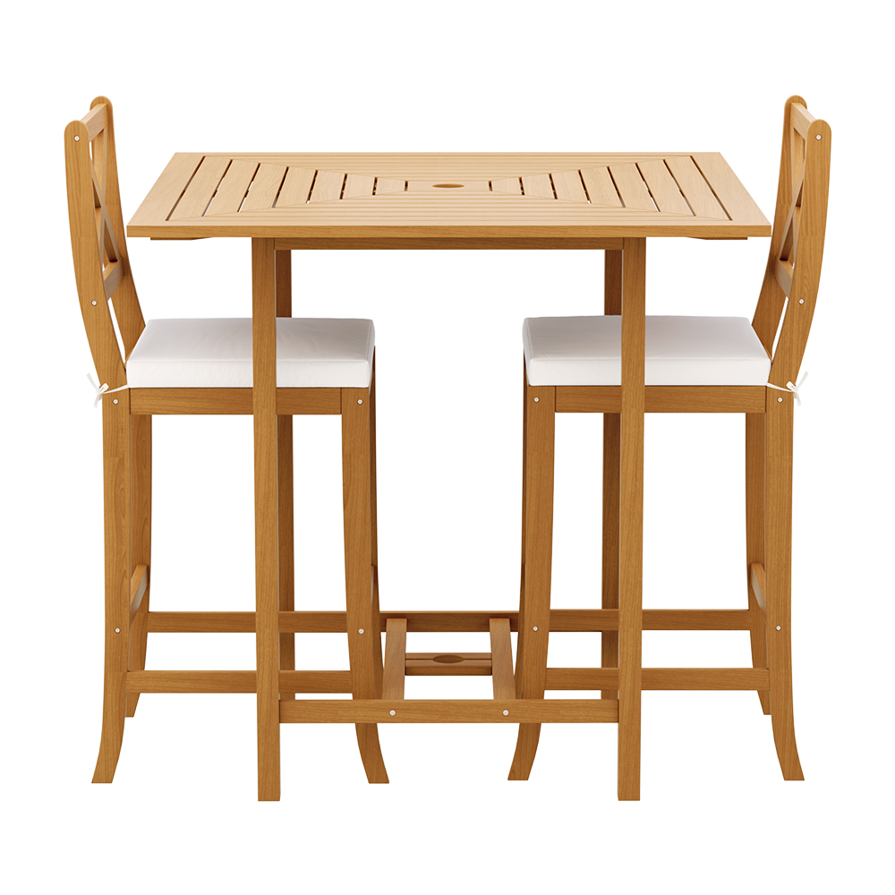 With summer fast approaching, you can once again join the sunshine with the Gardeon Outdoor Bar Set. Made from solid Acacia wood with a strong and durable finish, the set is designed for outdoor or indoor use in a wide range of weather conditions. The stable structure features a reinforced insert, and the table has a total weight capacity of 45kg. The table and chairs are designed to comfortably seat 4 people for an intimate gathering. The seats are classically designed and completely comfortable with an inclined backrest, built-in footrest, and 5cm thick foam cushions. The cushions feature removable and washable covers for easy cleaning. Relax under the sun with a versatile parasol hole in the middle of the table. With easy and hassle-free assembly the Gardeon Outdoor Bar Set is the perfect addition to any backyard, patio or even sitting room.