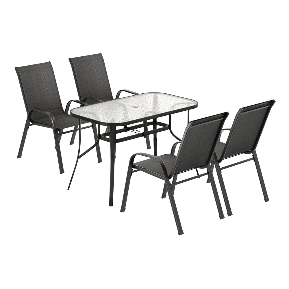 Elevate your outdoor living with the Gardeon 5 Piece Mesh Dining Set—perfect for sunny gatherings in fresh air! The rust-proof powder-coated steel frame ensures lasting durability, while the all-weather synthetic fabric resists sun, rain, and stains, keeping colors vibrant for years. The spacious tempered glass table features a convenient parasol hole for shade, and the stackable chairs maximize storage space. Floor protectors safeguard your surfaces while providing stability on uneven ground. With its sleek, versatile design, this set transitions seamlessly from patio to indoor dining. Low-maintenance and built for comfort, the Gardeon dining set is ideal for relaxing meals with family and friends under the open sky!