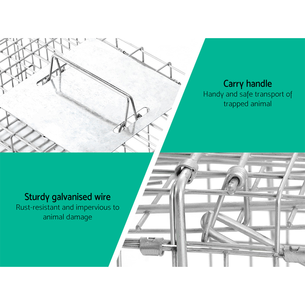 Made from quality rust resistant galvanised iron wire, this humane animal trap cage is built to last for years. Featuring spring loaded door trap with protected handle, automatic locking system that is swift in operation, this cage is designed to ensure safety of both animals and users. Perfect for removing pest animals in backyard and capturing pest alive. Collapsible design and can fold away quickly for easy storage and transportation.